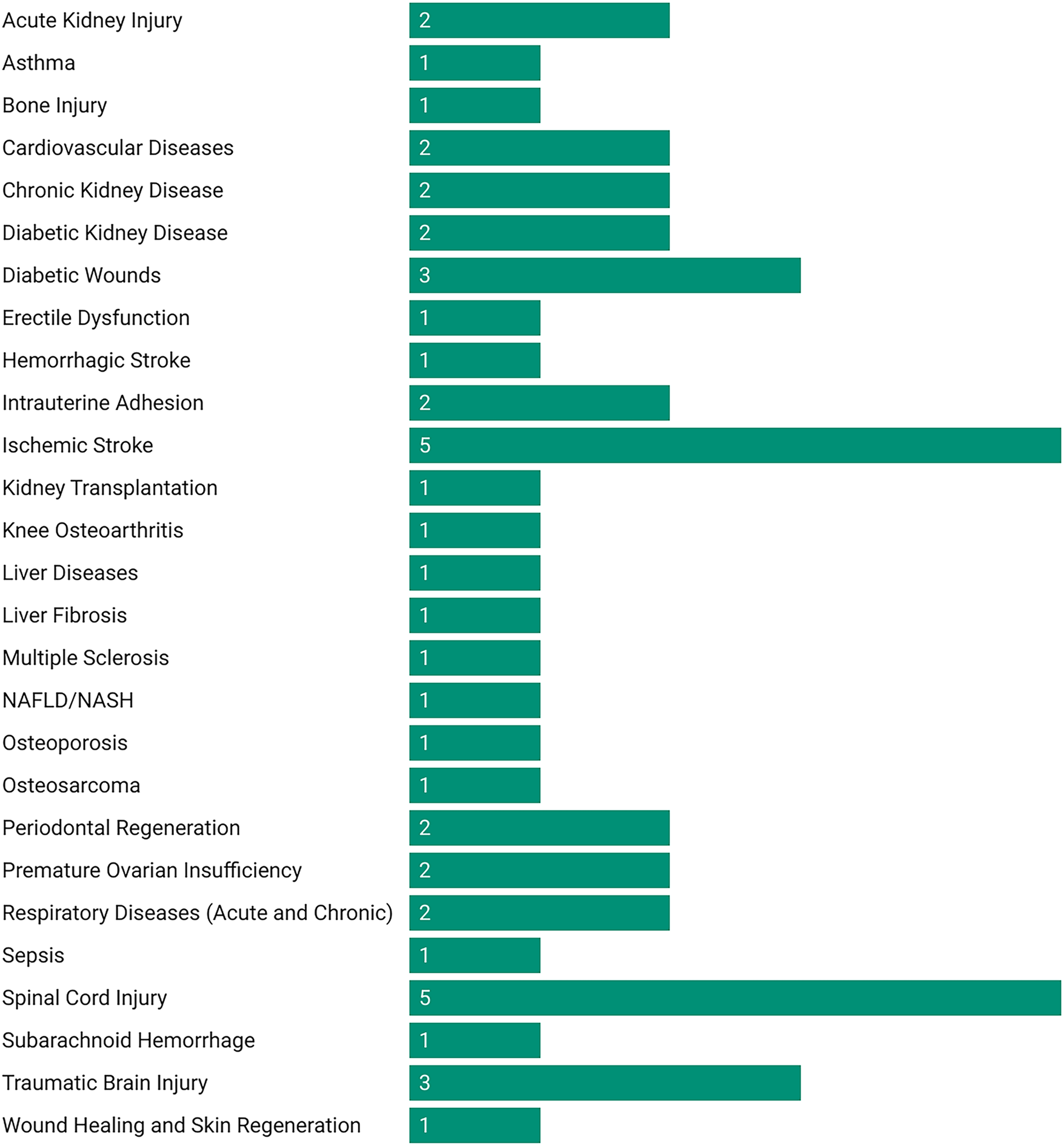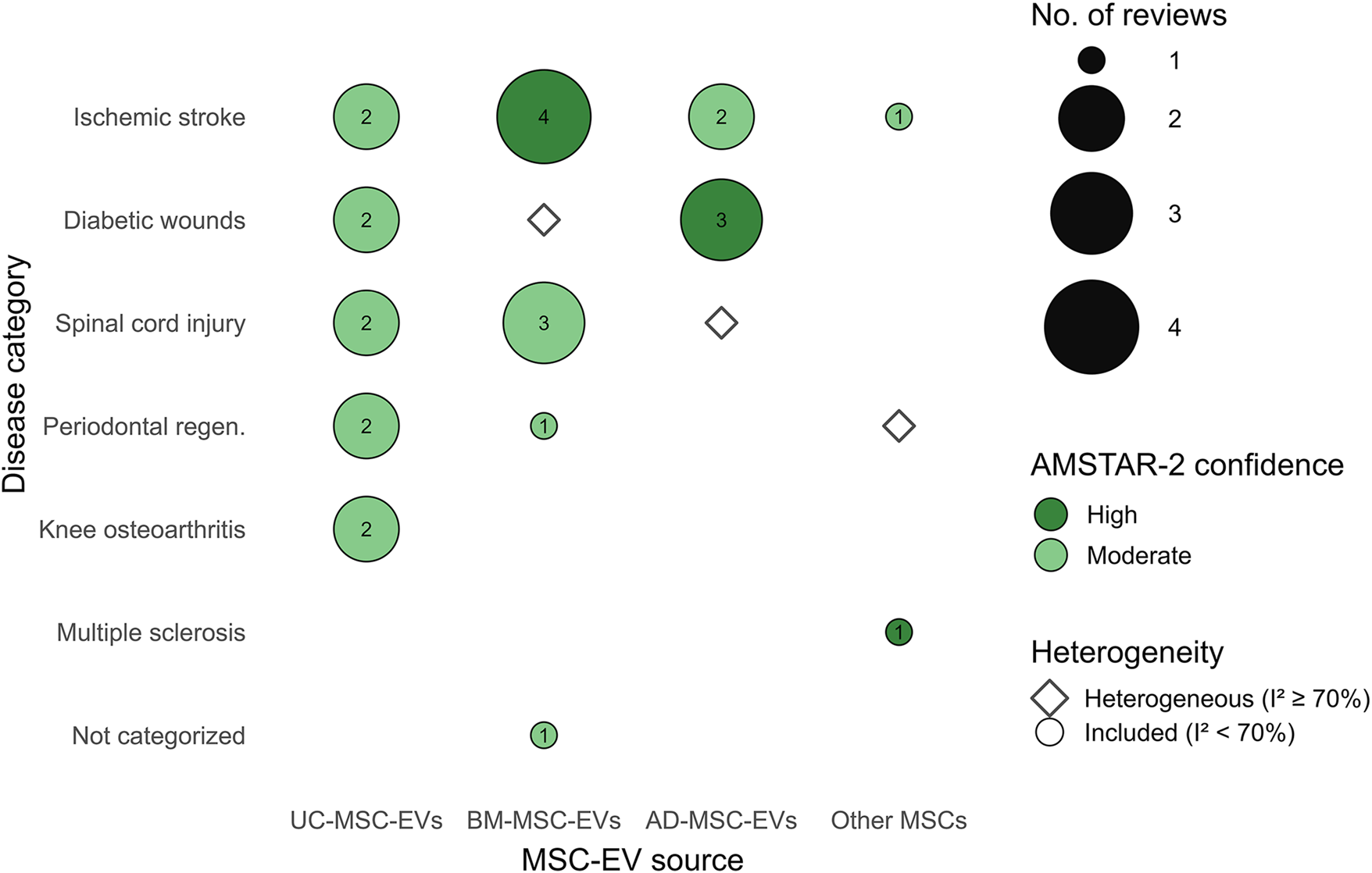 No additional meta-analyses were conducted within this umbrella review, as the aim was to synthesize and evaluate existing meta-analytic evidence rather than generate new pooled estimates. However, reported effect sizes were qualitatively summarized to identify therapeutic trends—for example, MSC-EVs demonstrated high efficacy in preclinical models of stroke and moderate effects in kidney transplantation models.