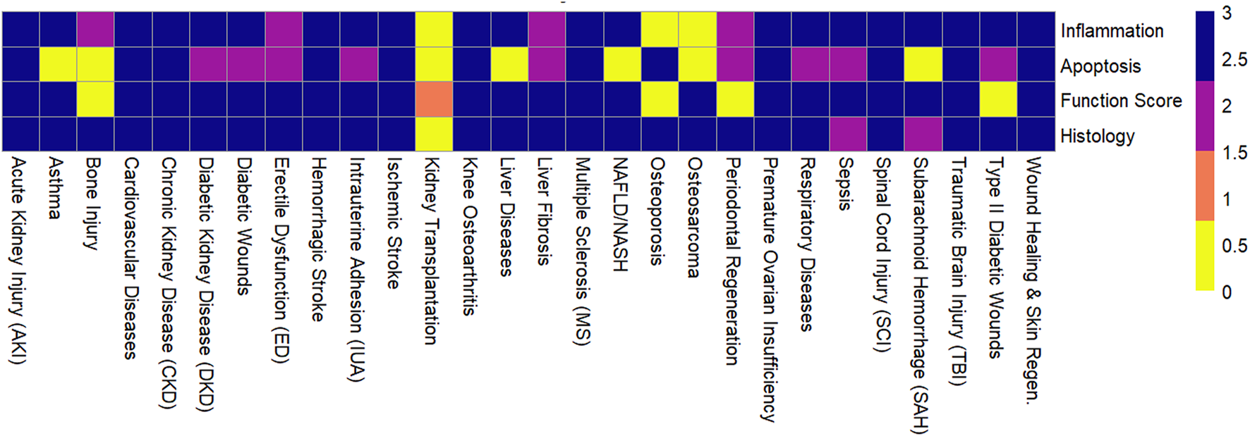 A narrative synthesis was performed to describe the diversity of conditions addressed in the included studies, the types and tissue sources of MSC-EVs used, the animal models employed, and the administration routes applied. This synthesis also outlined the primary outcomes assessed, their consistency across studies, and the proposed mechanisms of action, such as anti-inflammatory, anti-apoptotic, and regenerative effects. Findings were organized into comprehensive tables and illustrative figures to facilitate interpretation and comparison. For instance, Table 3 presents a detailed summary of exosome-based therapies across different diseases and conditions, while visual aids such as bar graphs and merged heatmaps were used to depict data trends and outcome distributions.