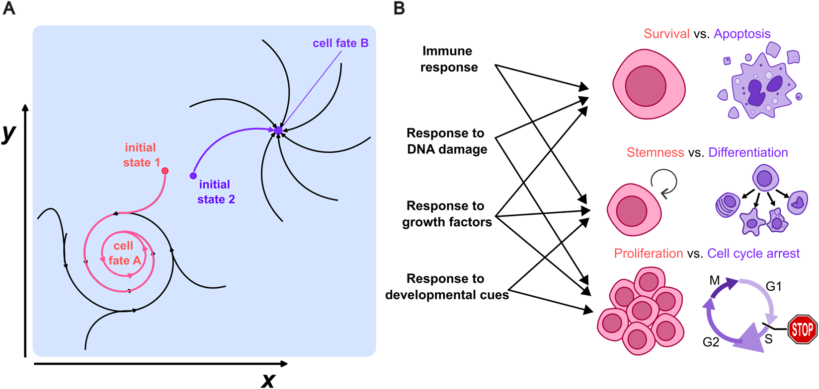 (A) Example of two possible attractors in the space of cell states (x, y) towards which a given cell can converge. Each corresponds to the fate of a cell upon a certain cue. (B) Examples of possible fates that go beyond the classic differentiation of cells taking place in development, to include the cell’s life-death or proliferation/cell cycle arrest decisions. Each of these cell fates could be mapped to a distinct attractor towards which the cell state can converge and might arise in different biological processes.