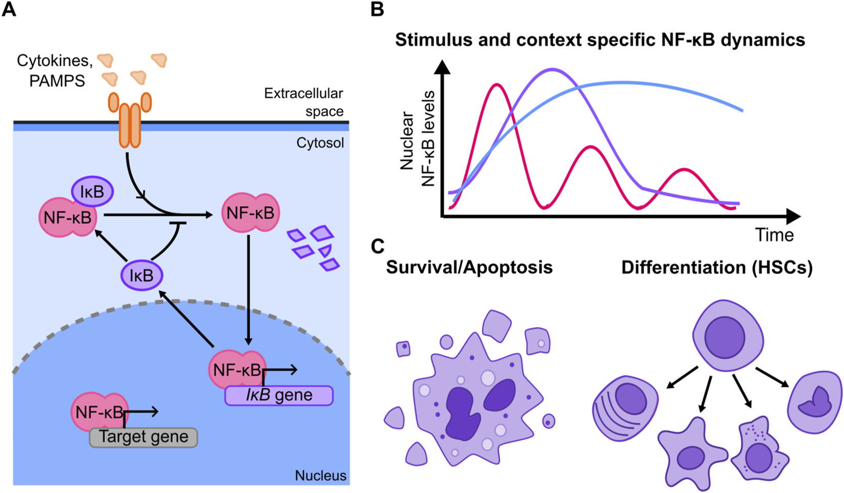 (A) Simplified scheme of the NF-κB signaling system showing its key negative feedback (other positive and negative feedbacks have been reported and are not shown). Stimulus triggers signaling cascades leading to the degradation of the inhibitors IκB that keep NF-κB sequestered in the cytosol, allowing NF-κB to localize into the nucleus. There, it drives the expression of its targets, which include the inhibitors themselves, which constitute a series of negative feedbacks. (B) Examples of the dynamics observed in the NF-κB signaling system; these dynamics are known to be stimulus and cell dependent to a large extent. (C) Cell fates that have been shown to be followed in an NF-κB dynamic-specific way, including cell death and differentiation into different hematopoietic cell types.