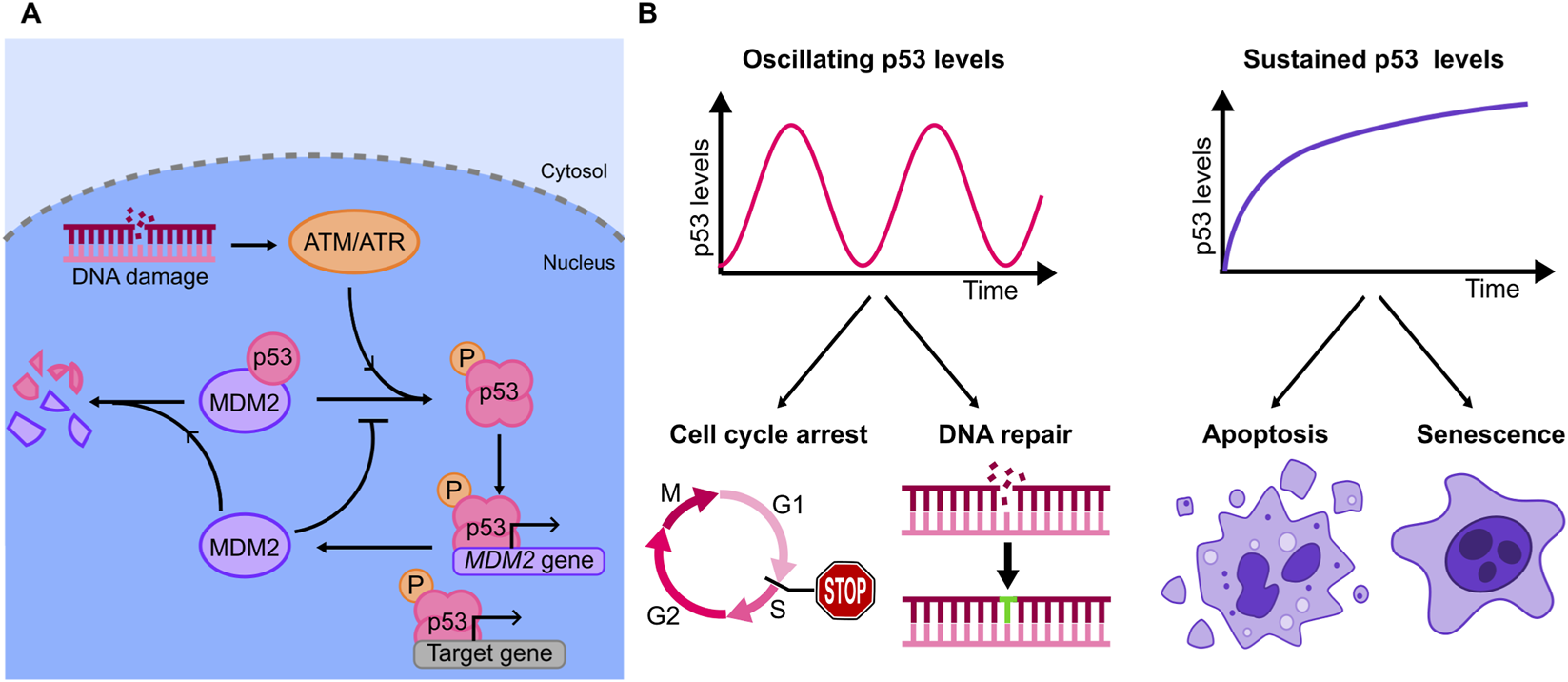 (A) Diagram of the principal elements of the p53 genetic circuit, involving the kinases ATM/ATR, and the key negative feedback, MDM2, that contributes to p53 degradation. (B) Examples of oscillatory and sustained dynamics observed for p53 upon specific stimuli (top), and corresponding outcomes in terms of cell fates (bottom): increasing evidence shows that oscillations are related with cell cycle arrest and DNA repair, while sustained dynamics can lead to apoptosis and senescence.