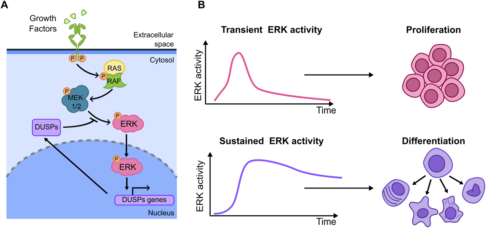 (A) Key elements of the ERK branch of the MAPKs signalling. (B) Different stimuli can lead to transient and sustained ERK activity (left). These in turn lead to distinct cell fates (right illustrations): transient activation has been linked to proliferation while sustained activation has been shown to promote cell differentiation in a number of cellular models.