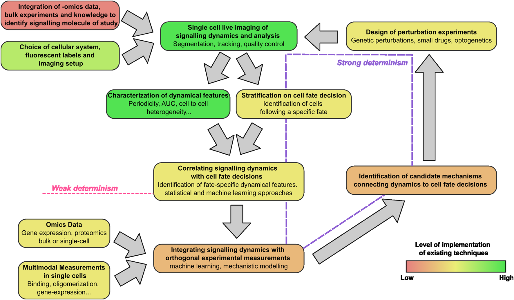 The live-cell imaging centered workflow to connect signaling dynamics and cell fate. The steps include the identification of the proper signaling dynamics to be characterized in each context, imaging and characterization of signaling dynamics, the connection with cell fate and the integration with orthogonal data (biophysical or omics). The color scale of the boxes from red to green indicates the current degree of development of each step in the workflow.