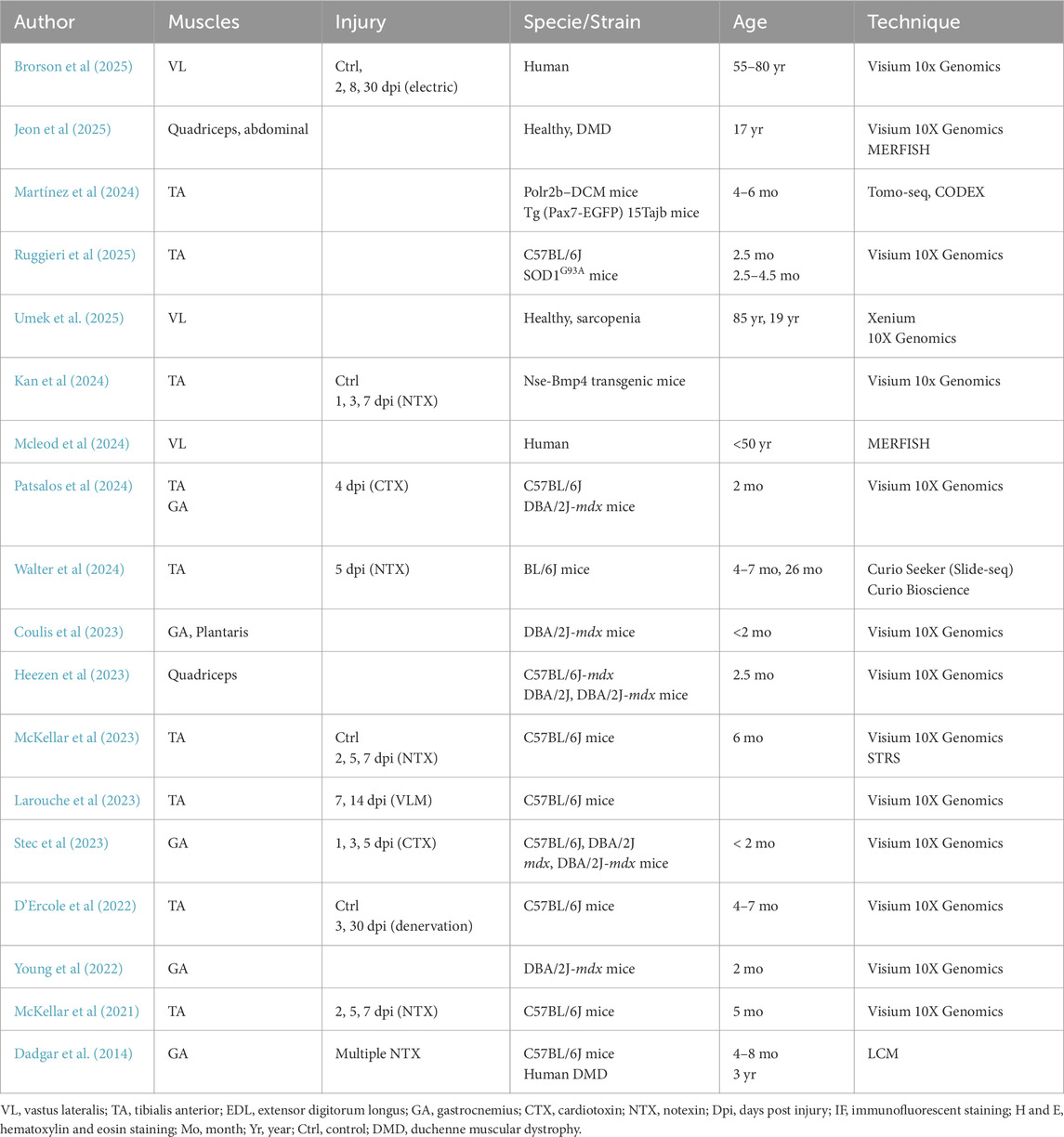 In recent years, the number of publications using ST to study muscle physiology and pathophysiology has steadily increased (Moses et al., 2022). So far, ST approaches have been used to study muscle injury (Dadgar et al., 2014; Kan et al., 2024; Patsalos et al., 2024; McKellar et al., 2023; Stec et al., 2023; McKellar et al., 2021; Brorson et al., 2025; Larouche et al., 2023), denervation (D’Ercole et al., 2022), and neuromuscular disorders, such as Amyotrophic Lateral Sclerosis (ALS) (Ruggieri et al., 2025) and Duchenne Muscular Dystrophy (DMD) (Patsalos et al., 2024; Stec et al., 2023; Jeon et al., 2025; Heezen et al., 2023; Coulis et al., 2023; Young et al., 2022). Most of these studies have used multiomics approaches, integrating ST with reference snRNA-seq data to enhance spatial resolution. These pioneering efforts have validated ST as a valuable tool for studying cellular heterogeneity, cell–cell interactions, and the diffusion of signaling molecules between different areas. In this review, we will discuss the main ST techniques and key bioinformatic tools, highlight recent advances in muscle biology enabled by ST, and address current limitations as well as future perspectives.