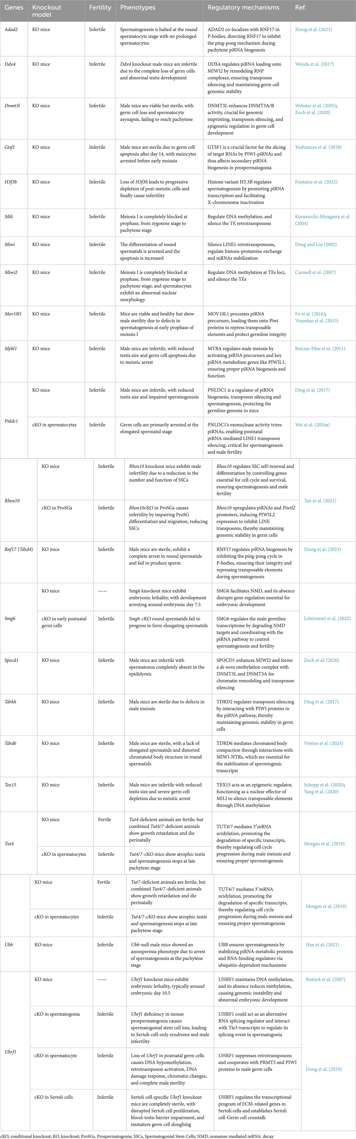 In humans, the PIWI protein family comprises four members: PIWIL1 (HIWI), PIWIL2 (HILI), PIWIL3, and PIWIL4 (HIWI2) (Li et al., 2024). In mice, the homologous proteins are designated as MIWI (PIWIL1), MILI (PIWIL2), and MIWI2 (PIWIL4) (Wei H. et al., 2024). The female-specific PIWIL3 is absent in mice and rats but can be identified in golden hamsters and bovine (Tan et al., 2020; Lv et al., 2023). Gene knockout mice of PIWI genes and associated factors in the piRNA pathway exhibit male fertility defects and varying degrees of spermatogenesis abnormalities, as shown in Table 1 (Dong et al., 2019; Bostick et al., 2007; Han et al., 2021; Morgan et al., 2019; Schopp et al., 2020; Yang et al., 2020; Vrettos et al., 2024; Lehtiniemi et al., 2022; Tan et al., 2021; Wei C. et al., 2024; Ding et al., 2017; Bolcun-Filas et al., 2011; Fu et al., 2016; Vourekas et al., 2015; Carmell et al., 2007; Deng and Lin, 2002; Kuramochi-Miyagawa et al., 2004; Fontaine et al., 2022; Yoshimura et al., 2018; Webster et al., 2005; Zoch et al., 2020; Wenda et al., 2017; Xiong et al., 2023). Notably, golden hamsters exhibit conserved expression patterns where PIWIL1 and PIWIL2 are predominantly cytoplasmic in prospermatogonia (Lv et al., 2023). PIWIL2 demonstrates dynamic co-localization with RNA-processing proteins mRNA-decapping enzyme 1A (DCP1A), Tudor domain-containing protein 1 (TDRD1), and mitochondrial ATP synthase F (1) complex subunit alpha (ATP5A) within both piP-bodies (a P granule that contains the PIWIL4-TDRD9 module) and IMC (Olotu et al., 2023; Wang X. et al., 2020). In contrast, PIWIL4 displays a dual subcellular distribution: cytoplasmic localization with DCP1A and Probable ATP-dependent RNA helicase DDX6 in piP-bodies coexists with nuclear accumulation, suggesting potential roles in both post-transcriptional regulation and chromatin-level processes (Lv et al., 2023).