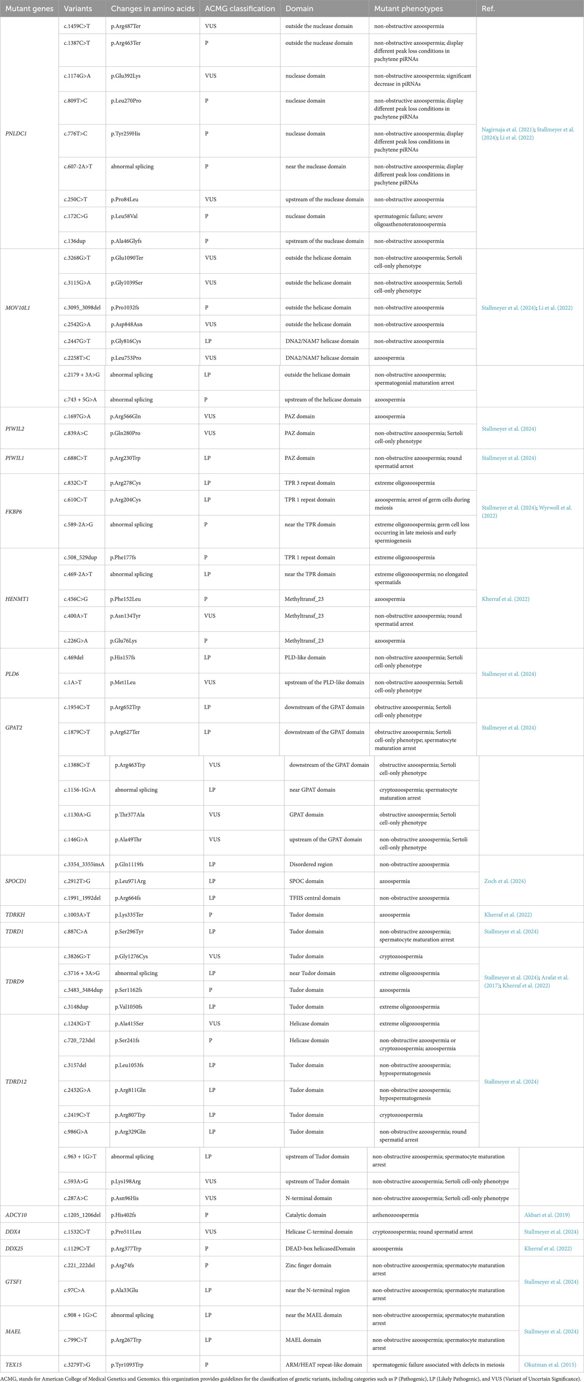 Among these genes, PNLDC1 plays a pivotal role in piRNA maturation. Nagirnaja et al. identified mutations in PNLDC1 in four unrelated men with non-obstructive azoospermia, demonstrating reduced expression of PIWIL1, PIWIL4, and other key piRNA pathway proteins in testicular tissue (Nagirnaja et al., 2021). Similarly, Li et al. discovered a homozygous PNLDC1 variant in a Han Chinese patient with severe oligoasthenoteratozoospermia through exome sequencing of 456 infertile patients (Li et al., 2022). Oligoasthenoteratozoospermia is one of the common diseases leading to male infertility, characterized by low sperm concentration, decreased motility and low percent of morphologically normal sperm (Colpi et al., 2018). In the same study, two compound heterozygous variants and a biallelic missense variant in MOV10L1 were identified in patients with non-obstructive azoospermia or severe oligozoospermia (Li et al., 2022). Oligozoospermia is characterized by a sperm concentration below the normattive threshold of 15 million sperm per milliliter of ejaculate observed in healthy males (Choy and Amory, 2020). Sperm concentrations ≤1 million/mL is considered as severe oligozoospermia (Bak et al., 2010). These findings suggest that mutations in key piRNA biogenesis proteins may contribute to dyszoospermia.