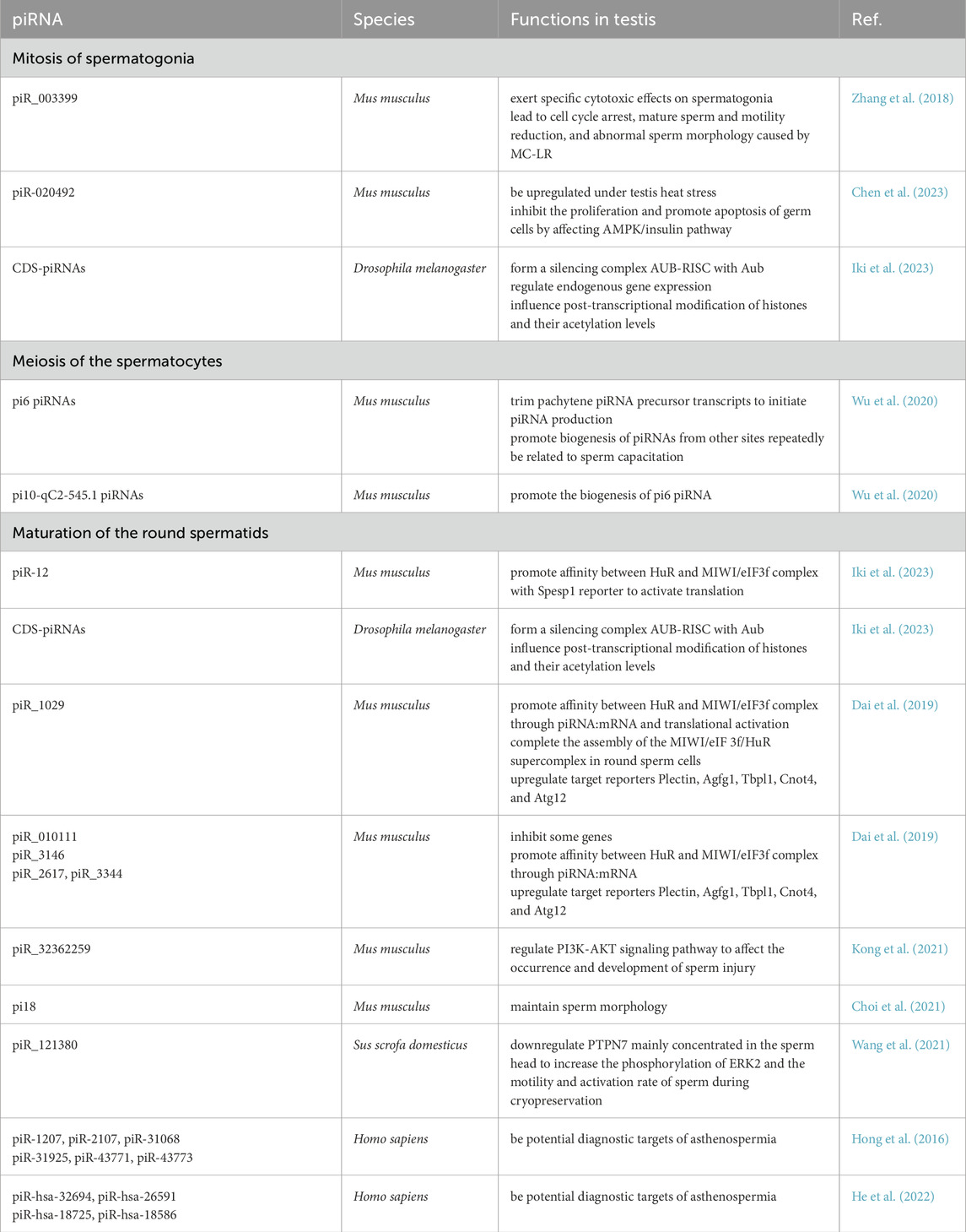The piRNA pathway plays a crucial role in male reproductive health, and its dysfunction is linked to infertility. Understanding the dynamic functions of piRNAs at different stages of spermatogenesis is essential for developing novel therapeutic strategies for male infertility (He et al., 2022; Wang et al., 2021) (Table 3).