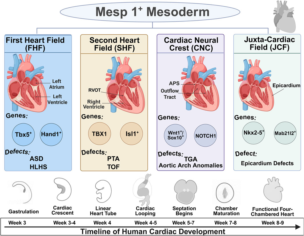 Figure 1. Developmental origins and lineage contributions of cardiac progenitor fields. Schematic illustration of the major cardiac progenitor lineages emerging from Mesp1+ mesoderm, including the First Heart Field (FHF), Second Heart Field (SHF), Cardiac Neural Crest (CNC), and Juxta-Cardiac Field (JCF). The timeline below depicts the sequential developmental stages of human cardiogenesis from gastrulation to formation of the four-chambered heart.