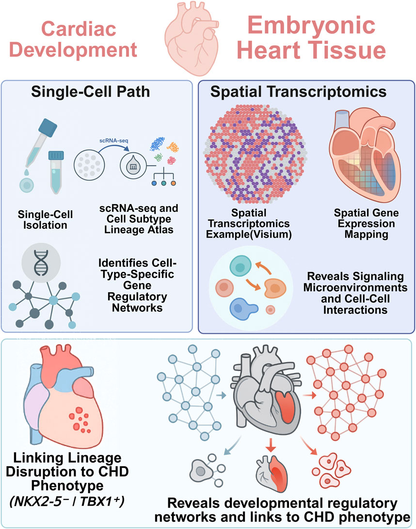 CHD arises from complex disruptions in cardiac development, yet its underlying mechanisms are often difficult to resolve due to the interplay of temporal, spatial, and cell-type–specific factors. With the advent of single-cell and spatial omics technologies, researchers now possess the tools to dissect these intricate processes with unprecedented resolution. This section explores how these innovations bridge the gap between genetic variation and phenotypic manifestation in CHD, integrating transcriptomic, epigenomic, and spatial information to construct a mechanistic framework of disease pathogenesis.