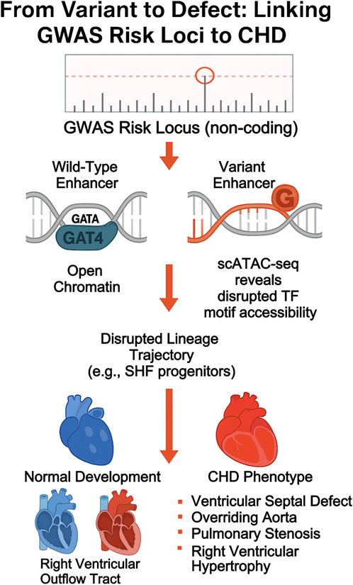 Figure 3. From variant to phenotype: linking non-coding GWAS loci to CHD mechanism. diagram tracing the cascade from GWAS variant to enhancer disruption, transcription factor binding loss, lineage misallocation, and eventual CHD manifestation.