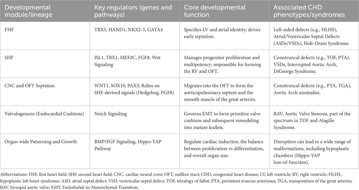 Table 1. Key developmental modules in cardiogenesis and their associated regulatory networks and CHD phenotypes.