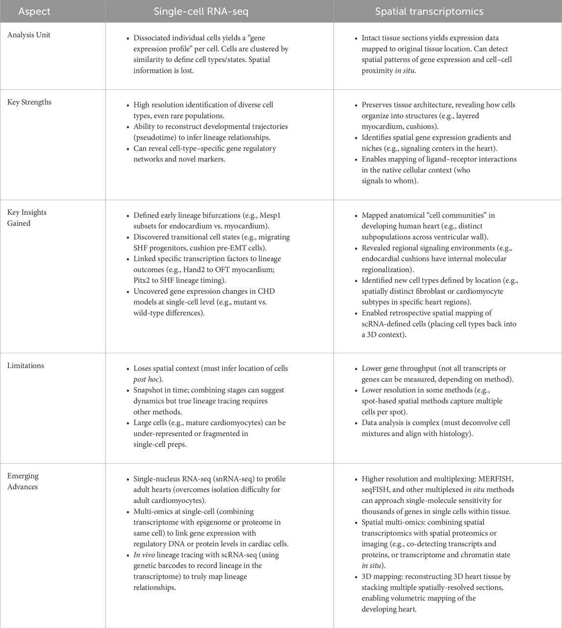 Spatial transcriptomics (ST), through platforms such as Visium and Multiplexed Error Robust Fluorescence In Situ Hybridization (MERFISH), reintroduces tissue context by measuring gene expression directly within intact tissue slices, enabling cell-type localization and neighborhood mapping in three dimensions (Choe et al., 2023; Nguyen et al., 2025). When combined, these technologies create a unified, multi-dimensional view of heart development, allowing researchers to infer signaling pathways, transcriptional hierarchies, and spatial cell-cell interactions—elements essential for understanding how genetic alterations disrupt normal morphogenesis in CHD. A detailed comparison of the strengths, limitations, and applications of these transformative technologies is provided in Table 2.