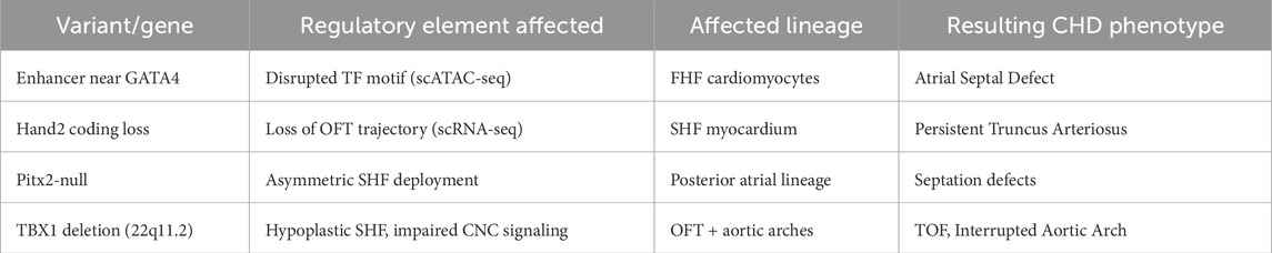Thus, enhancer-centric maps derived from scATAC-seq and multiome data offer a new lens through which to interpret non-coding GWAS hits, enabling functional annotation and cell-type–specific disease modeling. Figure 3 illustrates this pathway from a GWAS-identified risk locus to the eventual CHD phenotype, while Table 3 provides specific examples of variants linked to cellular and anatomical defects through multi-omic analysis.