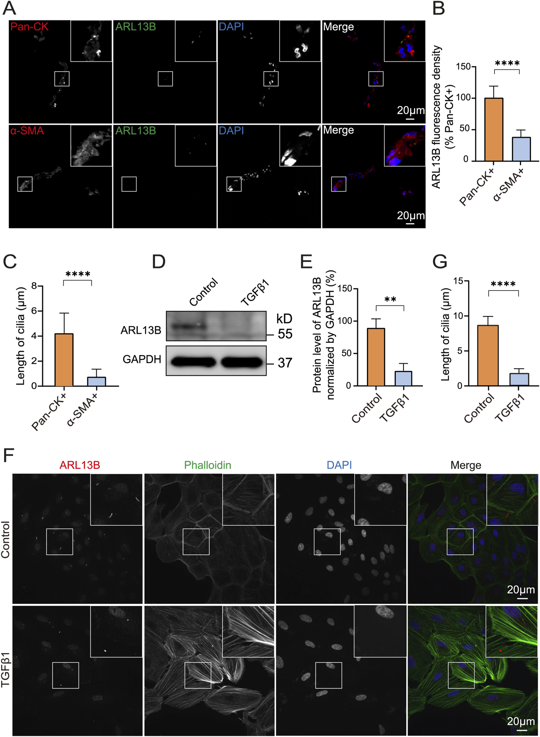 Reduced ARL13B protein levels in PVR and during the EMT of ARPE-19 cells. (A) Immunofluorescence staining of primary cilia protein ARL13B in PVR clinical specimens. ARL13B (green), Pan-CK (red), α-SMA (red), and DAPI (blue). (B,C) Quantification of ARL13B expression and cilia length (μm) in pan-CK+ and α-SMA + cells. (D) Western blot of ARL13B in ARPE-19 cells with TGF-β1treatment. (E) Statistical analysis of ARL13B expression in (D). (F) Immunofluorescence staining of ARL13B in ARPE-19 cells with TGF-β1 treatment. Cilia (ARL13B, red), cytoskeleton (Phalloidin, green), and nuclei (DAPI, blue). (G) Quantification of the cilia length (μm) in (F). Data are represented as mean ± SD. n = 3, **p < 0.01, ****p < 0.0001. Scale bar: 20 μm.