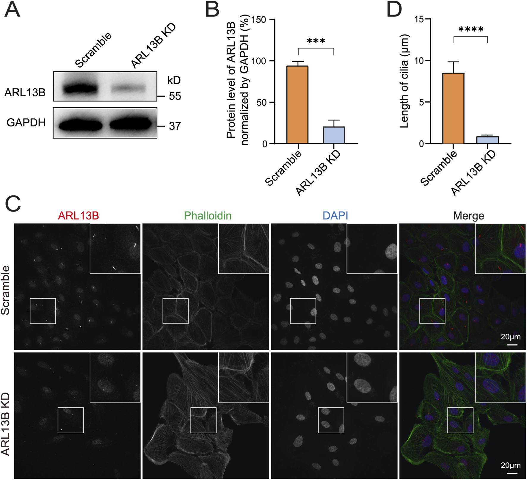 Loss of ARL13B leads to cilia deficiency. (A) Western blot of ARL13B in the scramble and ARL13B KD groups. (B) Quantification of ARL13B expression in (A). (C) Immunofluorescence staining of primary cilia in scramble and ARL13B KD groups. Cilia (ARL13B, red), cytoskeleton (Phalloidin, green), nuclei (DAPI, blue). (D) Quantification of cilia length (μm) in (C). Data are represented as mean ± SD. n = 3, ***p < 0.001, ****p < 0.0001, Scale bar: 20 μm.