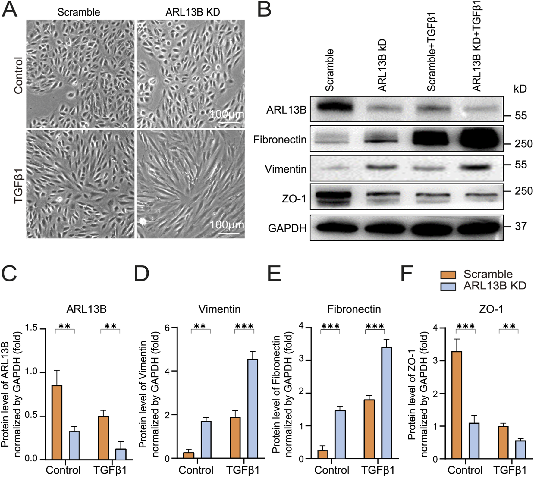 Effects of ARL13B on TGF-β1-induced EMT in RPE Cells. (A) Morphological changes in the scramble and ARL13B KD groups with or without TGF-β1. (B) Western blots of EMT markers (Fibronectin, Vimentin, ZO-1) in scramble and ARL13B KD groups with or without TGF-β1. (C–F) Quantification of protein expression in (B). Data are represented as mean ± SD. n = 3, *p < 0.05, **p < 0.01, ***p < 0.001. Scale bar: 100 μm.