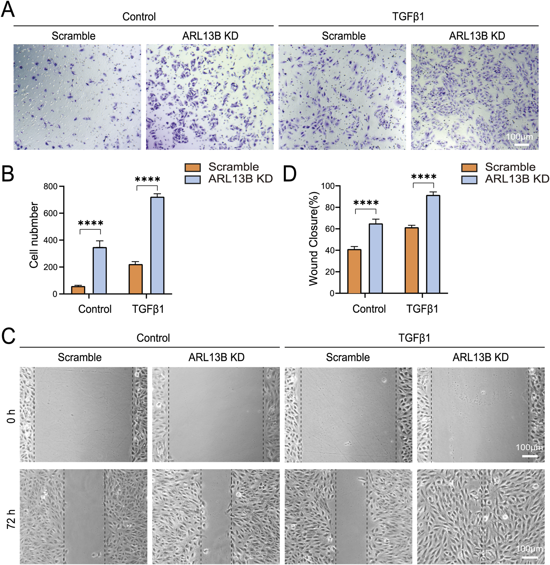 Effects of ARL13B on ARPE-19 cell migration. (A) Transwell assay in the scramble and ARL13B KD cells with or without TGF-β1. (B) Quantification of cells in (A). (C) Scratch assay in the scramble and ARL13B KD cells with or without TGF-β1 at 0 h and 72 h. (D) Quantification of the wound closure rate (%). Data are represented as mean ± SD. n = 3, ****p < 0.0001. Scale bar: 100 μm.