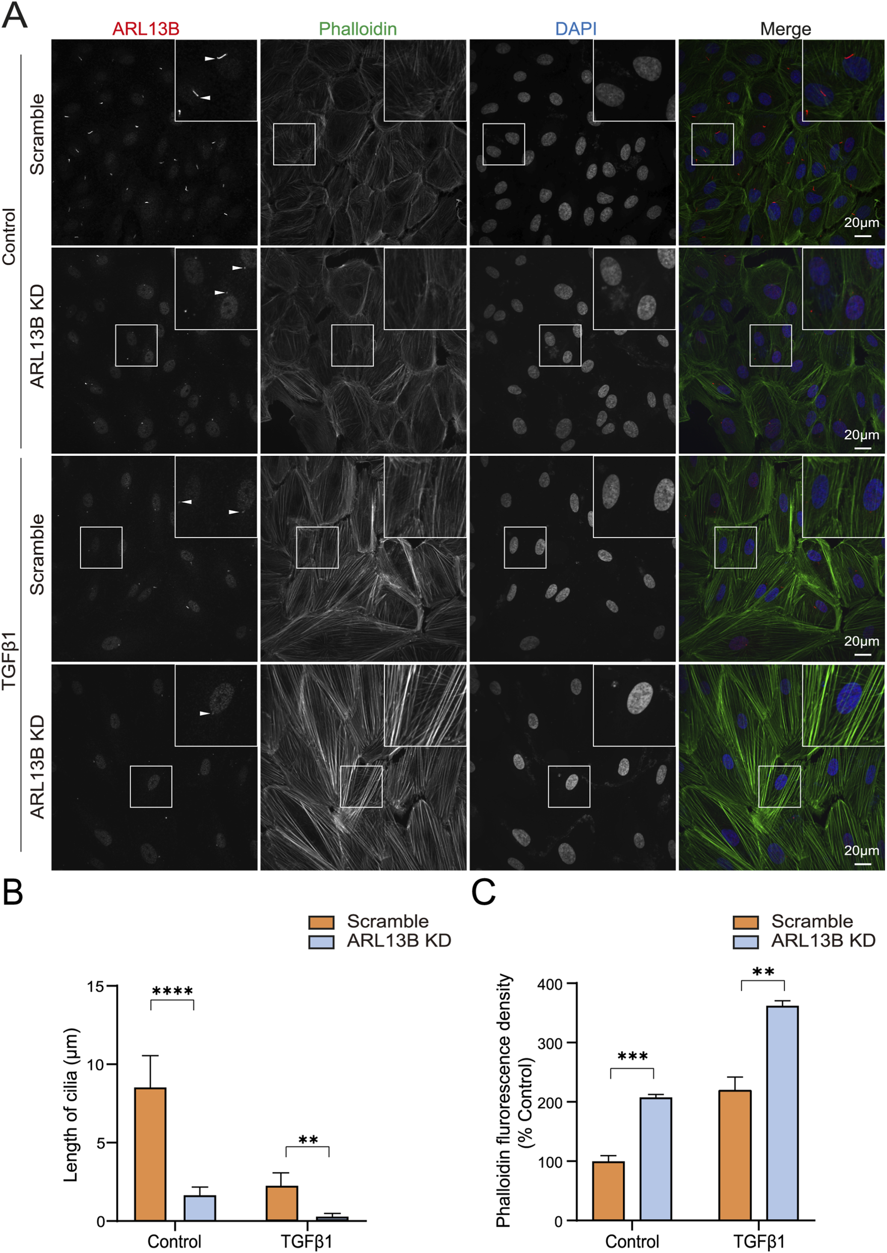 Cell migration relies heavily on a dynamic rearrangement of the actin cytoskeleton (Thapa et al., 2023). To investigate the cytoskeletal dynamics, we visualized the F-actin (filamentous actin) using phalloidin staining. The immunofluorescence staining revealed increased phalloidin upon ARL13B knockdown, with more pronounced changes in TGF-β1 treatment (Figures 7A,C). This cytoskeletal remodeling was correlated with the shortening of cilia length (Figure 7A,B). These data indicate that the loss of ARL13B enhances the migration of RPE cells.