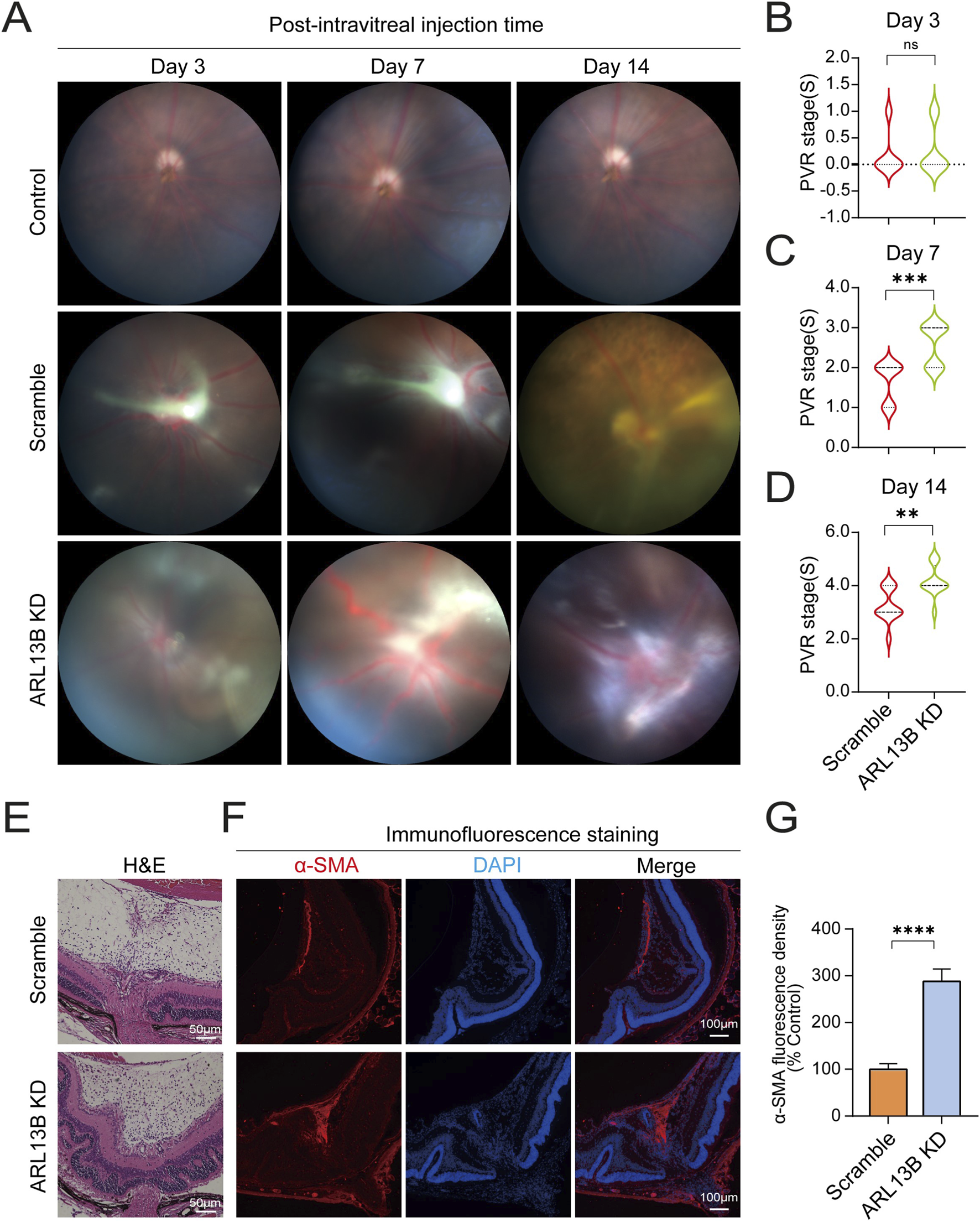 Effects of ARL13B on PVR formation in vivo. (A) The mouse fundus after intravitreal injection with scramble and ARL13B KD cells. (B–D) Statistical analysis of mice PVR stages at day 3 (B), day 7 (C), and day 14 (D) after intravitreal injection. (E) H&E stains of eye sections on day 14. (F) Immunofluorescence staining of α-SMA (red) of eye sections on day 14. Nuclei, (DAPI, blue). (G) Quantification of α-SMA fluorescence density in (F). Data were analyzed by the Mann-Whitney U test (n = 12). ns, no significance, **p < 0.01, ***p < 0.001. Scale bar: 100 μm.