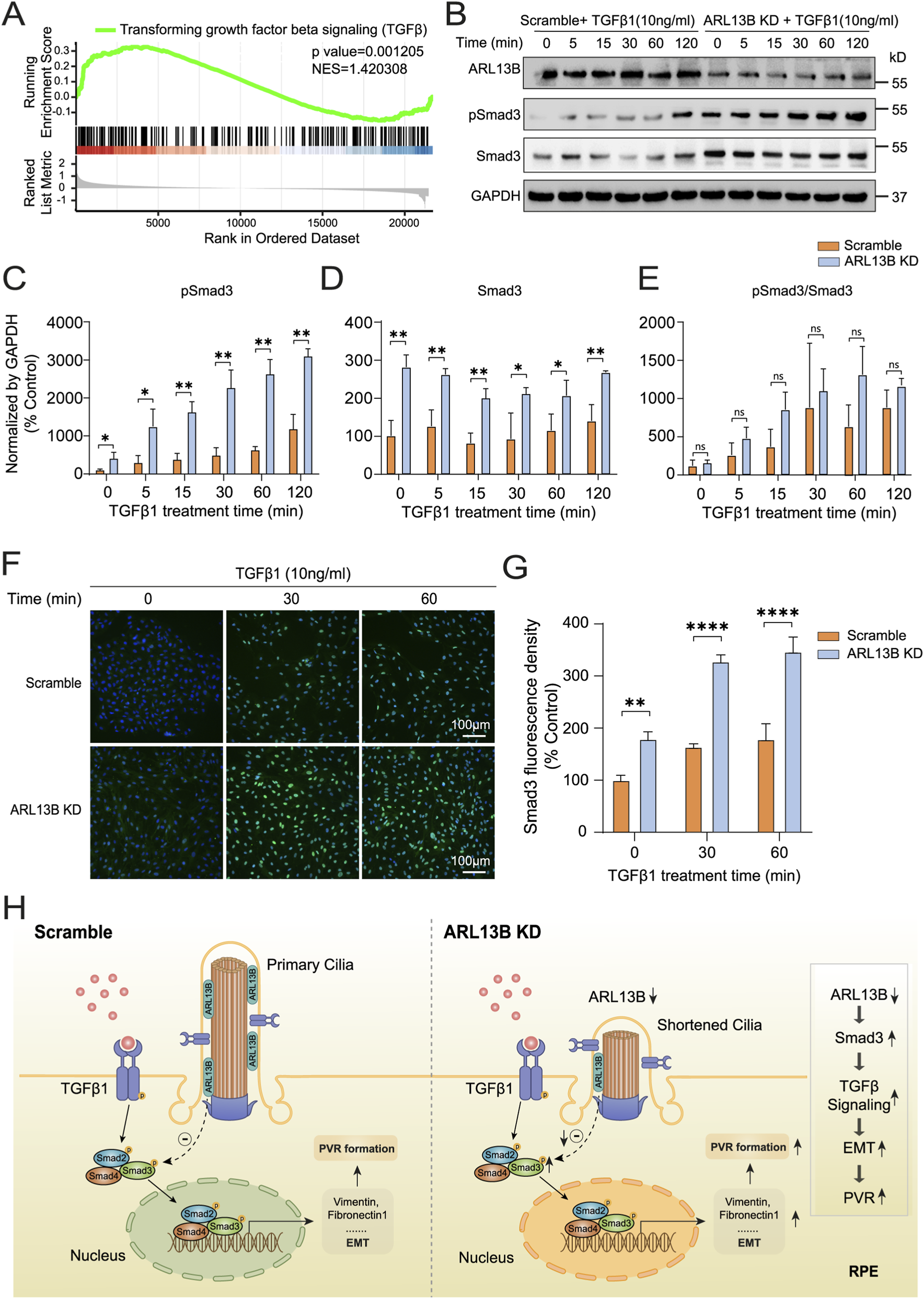Effects of ARL13B on TGF-β1 signaling in RPE cells. (A) GSEA terms of TGF-β1 genes in the scramble and ARL13B KD cells with TGF-β1. (B) Western blot of ARL13B, Smad3, and pSmad3 in the scramble and ARL13B KD group with TGF-β1 at different times. (C–E) Statistical analysis of the protein expression. (C) pSmad3, (D) Smad3, (E) the ratio of pSmad3/Smad3. (F) Immunofluorescence staining of Smad3 (green) in the scramble and ARL13B KD cells with TGF-β1 at different times, nuclei with DAPI (blue). (G) Quantification of the Smad3 fluorescence density in (F). (H) A diagram that shows the mechanism of the effect of ARL13B on TGFβ1-induced EMT of RPE in PVR. Data are represented as mean ± SD. n = 3, ns, no significance, *p < 0.05, **p < 0.01, ****p < 0.0001. Scale bar:100 μ.m.