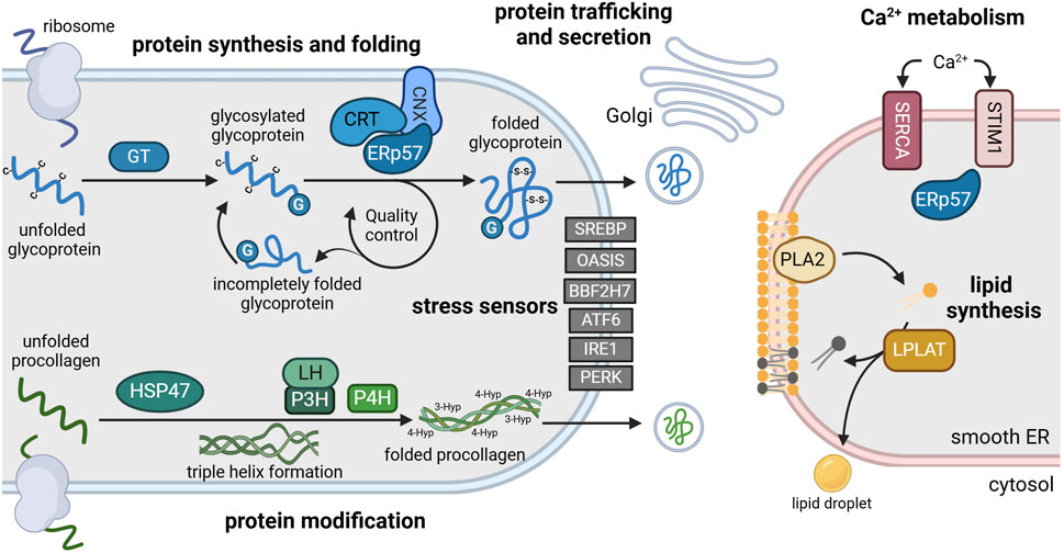 Figure 2. Main functions of the ER and its resident enzymes in chondrocytes. The rough ER (left) is the site of protein synthesis and processing. Here, nascent glycoproteins are translated into the lumen where they are glycosylated by glycosyltransferases (GT) (blue). Glycosylated glycoproteins (G) are recognized by a chaperone complex composed of ERp57 and calnexin (CNX) or calreticulin (CRT). This complex enables disulfide bridge formation (-S-S-) between cysteine residues (-C) that is essential for proper protein folding. Folded proteins are transported to the Golgi apparatus for secretion, while incompletely folded proteins re-enter the folding cycle. Newly synthesized procollagen is modulated by heat shock protein 47 (HSP47), lysylhydroxylases (LH) and prolyl-hydroxylases (P3H, P4H) to enable triple helix formation, folding and secretion (green). Various transcription factors including sterol element binding protein (SREBP), old astrocyte specifically induced substance (OASIS), BBF2 human homolog on chromosome 7 (BBF2H7), activating transcription factor 6 (ATF6), inositol-requiring enzyme 1 (IRE1) and pancreatic ER kinase (PERK) function as stress sensors, anchored in the ER membrane in an inactive state during homeostasis (grey). The smooth ER (right) is the main site of lipid synthesis (yellow) and Ca2+ storage (red). Phospholipase 2 (PLA2) and lysophosphosphatidylcholine acyltransferase (LPLAT) synthesize and remodel phospholipids that are incorporated into membranes or lipid droplets. Ca2+ influx is regulated by Ca2+ transporters such as sarco-endoplasmic reticulum calcium ATPase (SERCA) and stromal interaction molecule 1 (STIM1) via binding of ERp57. For references refer to the main text. Image created with BioRender.com.