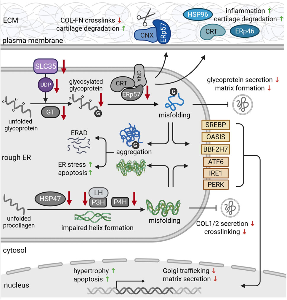 Figure 3. Protein dysfunction in the rough ER during chondrodysplasia and cartilage degeneration. Solute carrier family (SLC35) transporters provide uridine diphosphate (UDP)-sugars that serve as glycosylation substrates (purple). During osteoarthritis (OA), chondrocytes express reduced levels of SLC35. In addition, missense mutations in glycosyltransferases reduce glycoprotein glycosylation and glycosaminoglycan chain elongation. Reduced expression of chaperones such as ERp57, calnexin (CNX) and calreticulin (CRT) impairs the folding capacity of the ER, leading to protein misfolding. Misfolded proteins aggregate in the ER and are targeted for proteosomal degradation via ER-associated degradation (ERAD) pathways. ER retention of misfolded glycoproteins further reduces their secretion, causing ER stress and subsequent apoptosis. This eventually impairs cartilage matrix formation. During osteoarthritis (OA), CNX-ERp57 complexes (blue) can be transported to the cell surface, where they cleave disulfide bonds between collagens (COL) and fibronectin (FN), promoting cartilage degeneration. Secretion of chaperones such as calreticulin (CRT), ERp57 and heat shock protein 96 (HSP96) (blue) also triggers inflammation and cartilage degradation. Deficiencies of HSP4, prolyl- (P3H, P4H) and lysylhydroxylases impair the formation and stability of procollagen triple helices (green). This delays collagen secretion and crosslinking in the matrix and causes ER stress. Misfolded and aggregated proteins are recognized by the stress sensors in the ER membrane (yellow). Upon activation, they regulate gene expression in order to alleviate ER stress and mitigate misfolded protein load. For references refer to the main text. Image created with BioRender.com.