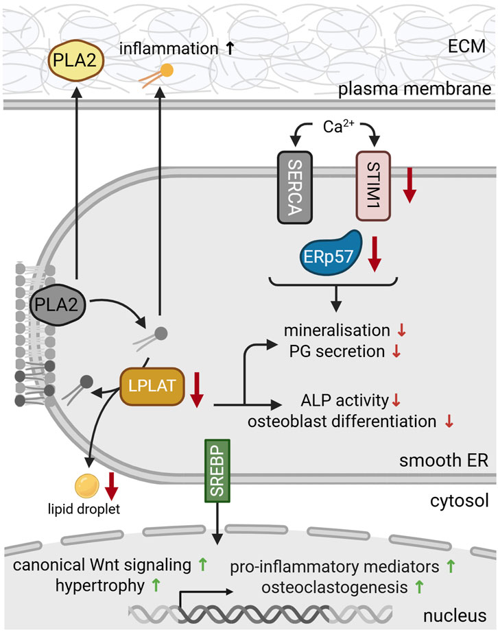 Figure 4. Protein dysfunction in the smooth ER during skeletal dysplasia and bone pathologies. During differentiation, reduced levels of LPLAT inhibit proteoglycan (PG) secretion and osteoclastogenesis. LPLAT deficiency (yellow) further reduced alkaline phosphatase (ALP) activity and bone mineralization and impaired lipid droplet formation. Deficiencies in Ca2+ transporters and sensors such as stromal interaction molecule 1 (STIM1) (pink) and ERp57 (blue), respectively, disrupt the luminal Ca2+ metabolism, aggravating dysfunctional mineralization and matrix secretion. ER stress and deficient luminal lipid levels activate membrane bound sterol regulatory element-binding proteins (SREBP) (green). Upon translocation to the nucleus, SREBPs regulate gene expression to stimulate lipid synthesis, while also promoting canonical Wnt signaling, hypertrophic differentiation, osteoclastogenesis and the transcription of pro-inflammatory mediators. Secreted phospholipase 2 (PLA2) and phospholipids (yellow) also promote the production of pro-inflammatory mediators, contributing to inflammation and OA progression. For references refer to the main text. Image created with BioRender.com.