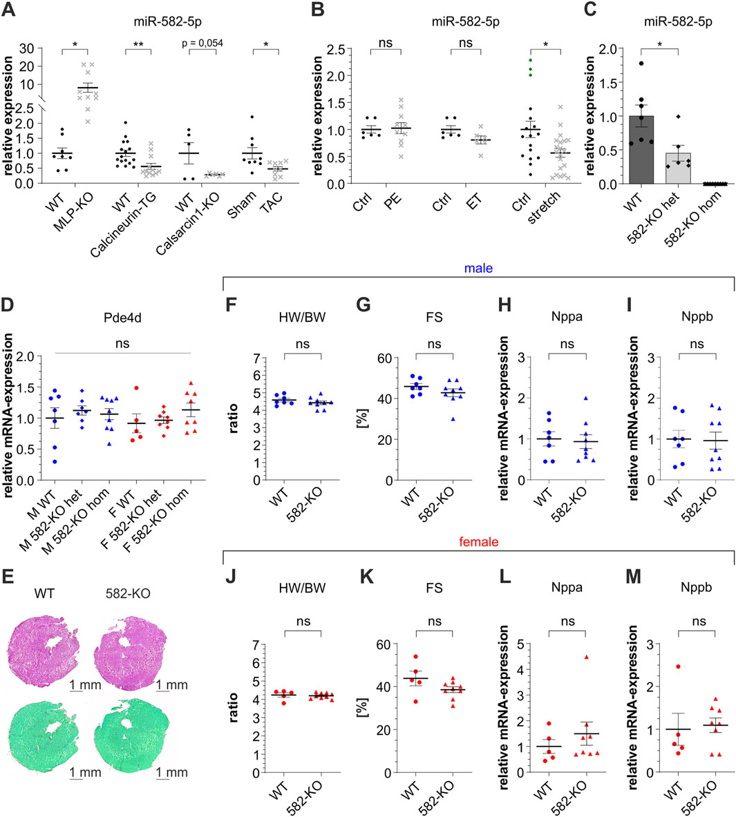 Figure 1. Expression of miR-582-5p and basic characterization of 582-KO mice. Relative expression of miR-582-5p in different in vivo ((A), mouse) and in vitro ((B), NRVCM) models of cardiomyopathy, n = 5-16 (mice), n = 2-4 experiments (NRVCM), (C) relative expression of miR-582-5p in heterozygous and homozygous 582-KO mice, (D) RNA-expression of Pde4d in male (blue) and female (red) mice, (E) Hematoxylin-eosin staining (top) and Sirius Red/Fast Green Collagen Staining (bottom), (F–I) morphometric and echocardiographic data and expression of Nppa and Nppb in male mice, (J–M) morphometric and echocardiographic data and expression of Nppa and Nppb in female mice, n = 5-9 animals, (BW, body weight; Ctrl, control; ET, endothelin 1; F, female; FS, fractional shortening; het, heterozygous; hom, homozygous; HW, heart weight; KO, knockout; M, male; PE, phenylephrine; WT, wildtype, *p < 0.05, **p < 0.01, ***p < 0.005, ns, not significant).