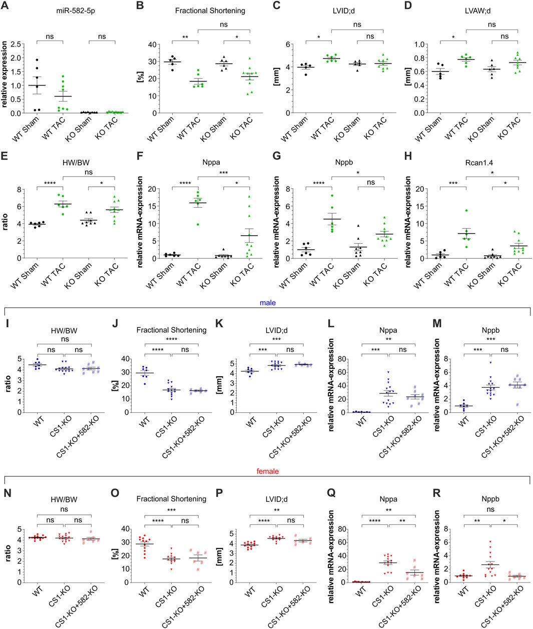 Figure 2. TAC surgery in male 582-KO mice (A–H) and crossbreeding CS1-KO/582-KO mice (I-R). (A) relative expression of miR-582-5p, (B–D) echocardiographic data, (E) Heart weight/body weight ratio, (F–H) expression of Nppa, Nppb and Rcan1.4 (n = 5-10 animals), (I–R) morphometric and echocardiographic data and expression of Nppa and Nppb of male (I–M) and female (N–R) CS1-KO/582-KO cross bred mice, n = 6-15 animals (BW, body weight; CS1, Calsarcin-1; HW, heart weight; KO, knockout; LVAW; d, left ventricular anterior wall thickness at end-diastole; LVID; d, left ventricular internal diameter at end diastole; TAC, transverse aortic constriction; WT, wildtype, *p < 0.05, **p < 0.01, ***p < 0.005, ****p < 0.001, ns, not significant).