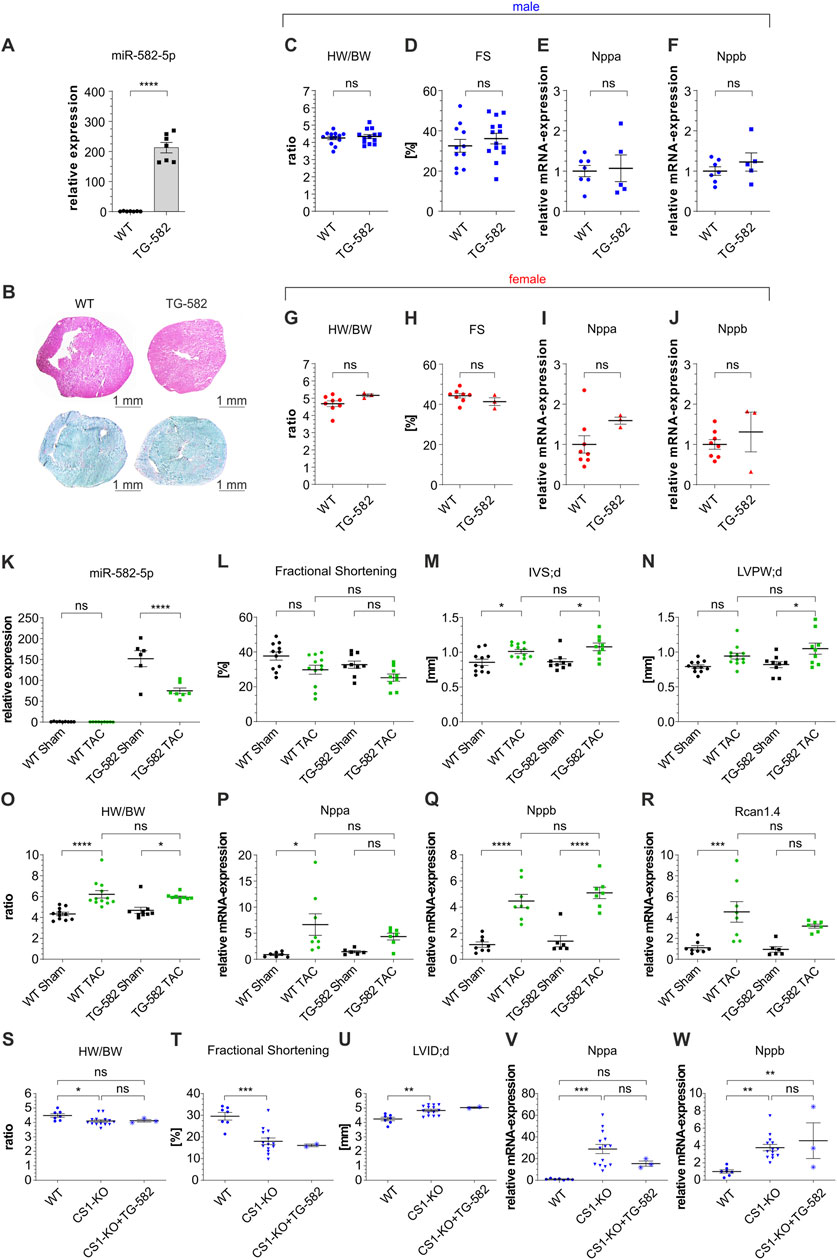 Figure 3. Basic characterization of TG-582 mice (A–J), TAC surgery in male TG-582 mice (K–R) and crossbreeding of male CS1-KO/TG-582 mice (S-W). (A) relative expression of miR-582-5p, (B) Hematoxylin-eosin staining (top) and Sirius Red/Fast Green Collagen Staining (bottom), (C–F) morphometric and echocardiographic data and expression of Nppa and Nppb in male mice, (G–J) morphometric and echocardiographic data and expression of Nppa and Nppb in female mice, n = 3-14 animals; (K) relative expression of miR-582-5p, (L–N) echocardiographic data, (O) Heart weight/body weight ratio, (P–R) expression of Nppa, Nppb and Rcan1.4, n = 6-12 animals; (S–W) morphometric and echocardiographic data and expression of hypertrophic marker genes in male CS1-KO/TG-582 cross bred mice, n = 2-14 animals, (BW, body weight; CS1, Calsarcin-1; FS, fractional shortening; HW, heart weight; IVS; d, interventricular septal thickness at end-diastole; KO, knockout; LVID; d, left ventricular internal diameter at end diastole; LVPW; d, diastolic left ventricular posterior wall thickness at end-diastole; TAC, transverse aortic constriction; WT, wildtype, *p < 0.05, **p < 0.01, ***p < 0.005, ****p < 0.001, ns, not significant).