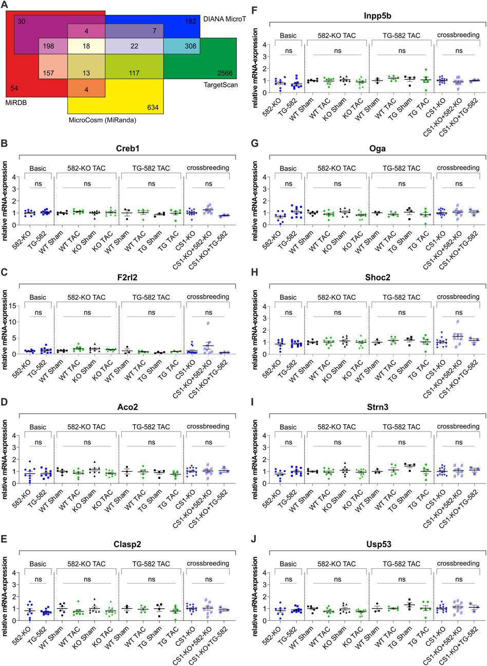 Figure 4. In silico target prediction (A) and relative RNA-expression of published (B,C) and predicted (D–J) target genes of miR-582-5p. (A) In silico target prediction employing the algorithms: MicrocCosm (miRanda), TargetScan, MiRDB (MirTarget) and DIANA-MicroT yielding 18 overlapping predicted target genes, (B–J) relative RNA-expression of previously identified miR-582-5p target genes Creb1 (B) and F2rl2 (C) and relative RNA-expression of seven predicted miR-582-5p target genes (D–J) in 582-KO and TG-582 mice, 582-KO and TG-582 mice after TAC-surgery and in CS1-KO mice crossbred with 582-KO and TG-582 mice respectively, n = 3-13. (CS1, Calsarcin-1; KO, knockout; TAC, transverse aortic constriction; WT, wildtype; ns, not significant).