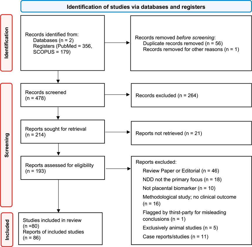 Studies that examined the relationship between placenta-derived biomarkers in the context of adverse neurodevelopmental outcomes during the perinatal period in human subjects and written in English were included. Any type of review article, case reports, or editorials were excluded.