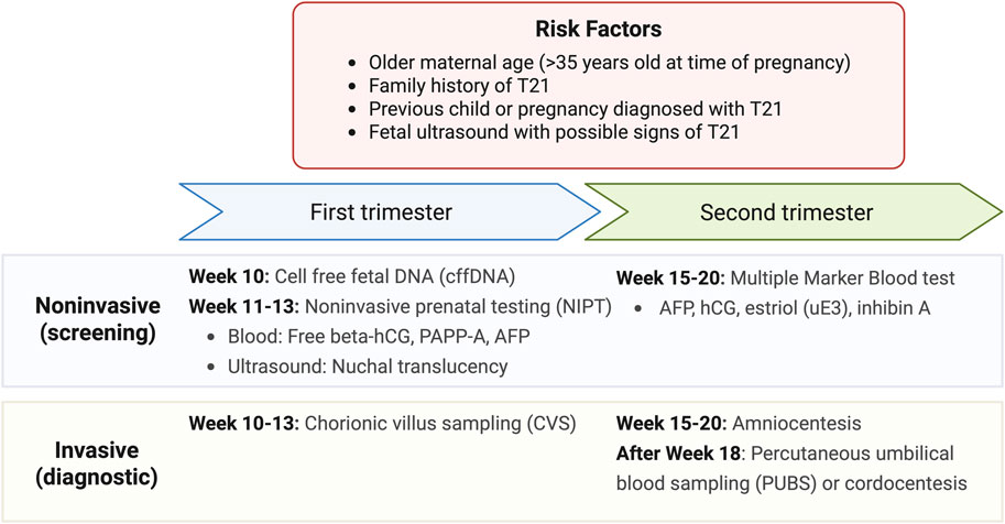 At this time, prenatal T21 testing includes noninvasive screening and invasive diagnostic tests as illustrated in Figure 2 (MedlinePlus Medical Test, 2025). These are typically performed for expectant mothers with risk factors such as older maternal age (>35 years of age at time of pregnancy), family history of T21, having a previous child or pregnancy diagnosed with T21, and a fetal ultrasound with possible signs of T21. Looking to the future, it continues to be important to improve the cost-effectiveness of testing while reducing the rates of false positives. This demonstrates the process of developing minimally invasive and high specificity diagnostic tools to improve neurological outcomes in fetuses and neonates–a process that will continue to evolve for other neurodevelopmental outcomes described below.