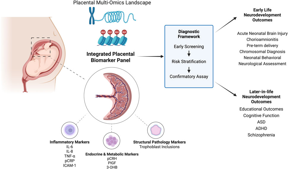 As discussed, the placenta also modulates numerous interactions across the maternal-fetal axis. Current studies on placental biomarkers highlight their diverse roles in inflammation, hypoxic signaling, timing of delivery, hormone and metabolic regulation, and various omics-related pathways as listed in Table 2. Beyond established use in T21 and select genetic disorders (e.g. T13, T18), placental biomarkers for other neurodevelopmental outcomes remain exploratory and have yet to enter routine clinical practice. Figure 3 highlights the promise of an integrated biomarker approach in this expanding area of research.