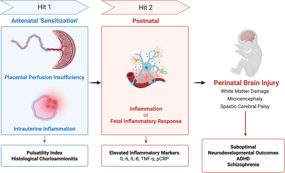 Subsequent work broadened the model to intrauterine inflammation. Some cases of histological chorioamnionitis (HCA) progress to fetal inflammatory response (FIR) and at its extreme to fetal inflammatory response syndrome (FIRS). Conversely, non-infectious stressors like hypoxia-ischemia can trigger FIR/FIRS in the absence of HCA. These infectious or sterile pathways describe two related intrauterine ‘hits’ in preterm infants. Regardless of the initiating pathway, elevated cytokine levels (IL-6, IL-8, G-CSF) in the umbilical cord correlated with increased severity of brain injury (Lu et al., 2016). Some researchers speculated that the first ‘hit’ may be sensitizing the fetal brain to subsequent perinatal or postnatal stressors.