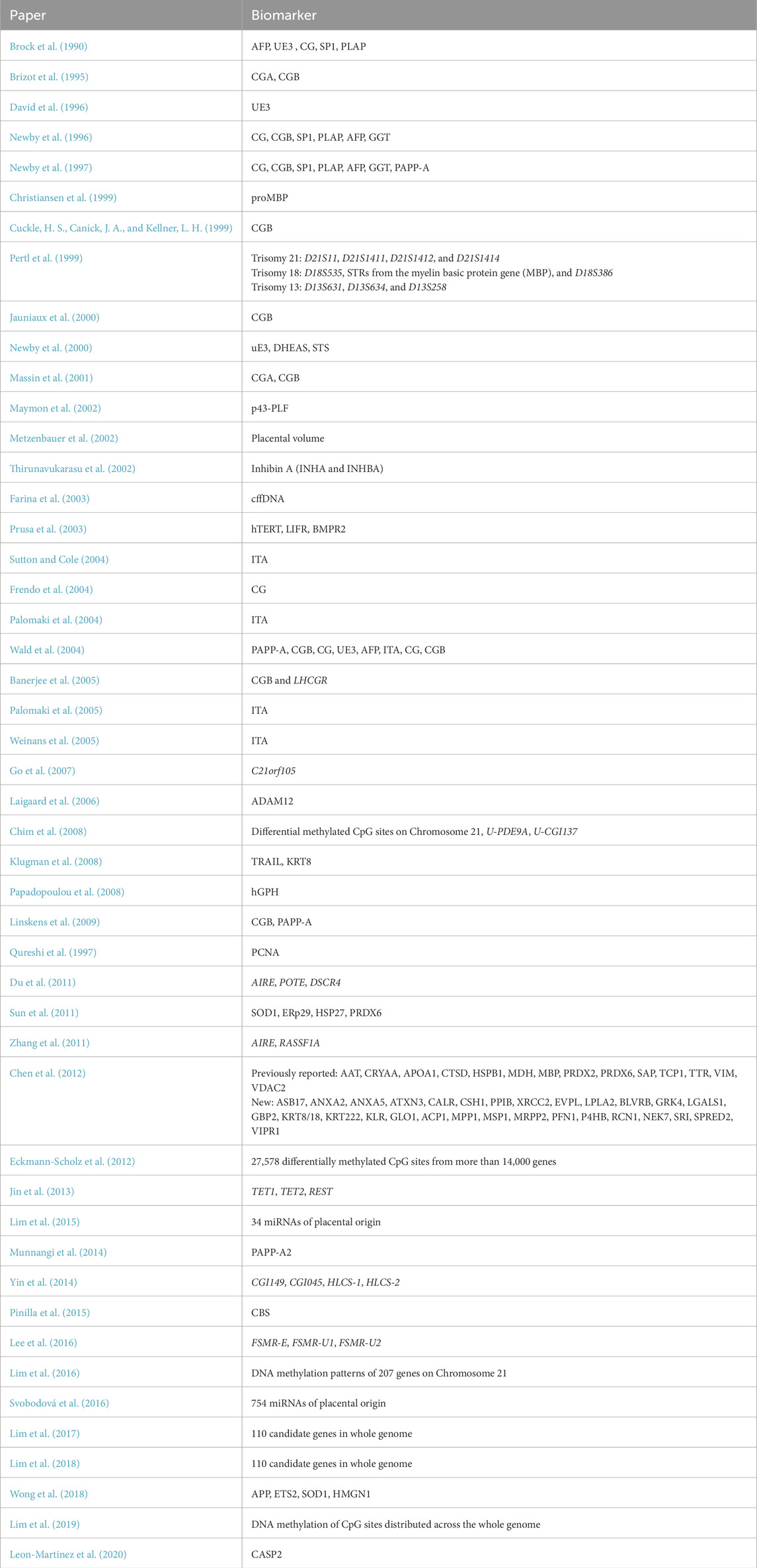 Table 1. Summary of biomarkers discussed for use in T21 screening (Mj et al., 2022; Pertl et al., 1999; Jauniaux et al., 2000; Metzenbauer et al., 2002; Brock et al., 1990; Brizot et al., 1995; David et al., 1996; Newby et al., 1996; Cuckle et al., 1999; Newby et al., 2000; Christiansen et al., 1999), (Palomaki et al., 2004; Wald et al., 2004; Weinans et al., 2005; Palomaki et al., 2005; Thirunavukarasu et al., 2002; Chim et al., 2008; Du et al., 2011; Zhang et al., 2011; Eckmann-Scholz et al., 2012; Jin et al., 2013; Yin et al., 2014; Lee et al., 2016; Lim et al., 2016; Lim et al., 2017; Lim et al., 2018), (Gordevičius et al., 2020; Lim et al., 2015; Svobodov et al., 2016; Newby et al., 1997; Massin et al., 2001; Maymon et al., 2002; Farina et al., 2003; Prusa et al., 2003; Frendo et al., 2004; Banerjee et al., 2005; Go et al., 2007; Laigaard et al., 2006; Klugman et al., 2008; Papadopoulou et al., 2008; Linskens et al., 2009; Qureshi et al., 1997; Sun et al., 2011; Chen et al., 2012; Munnangi et al., 2014; Pinilla et al., 2015; Wong et al., 2018).