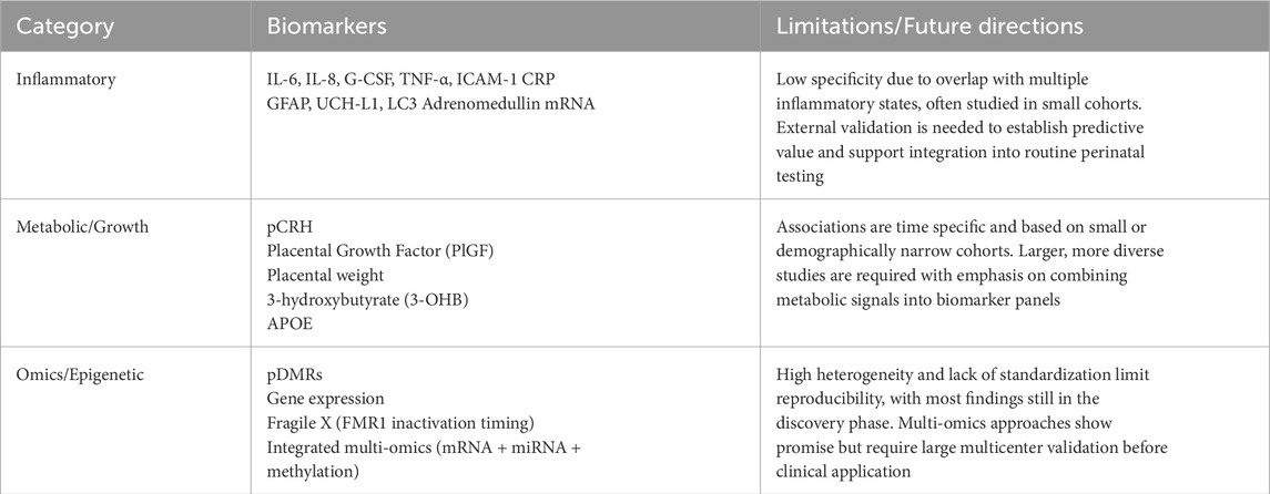 Table 2. Summary of exploratory placental biomarkers with current limitations and future directions.