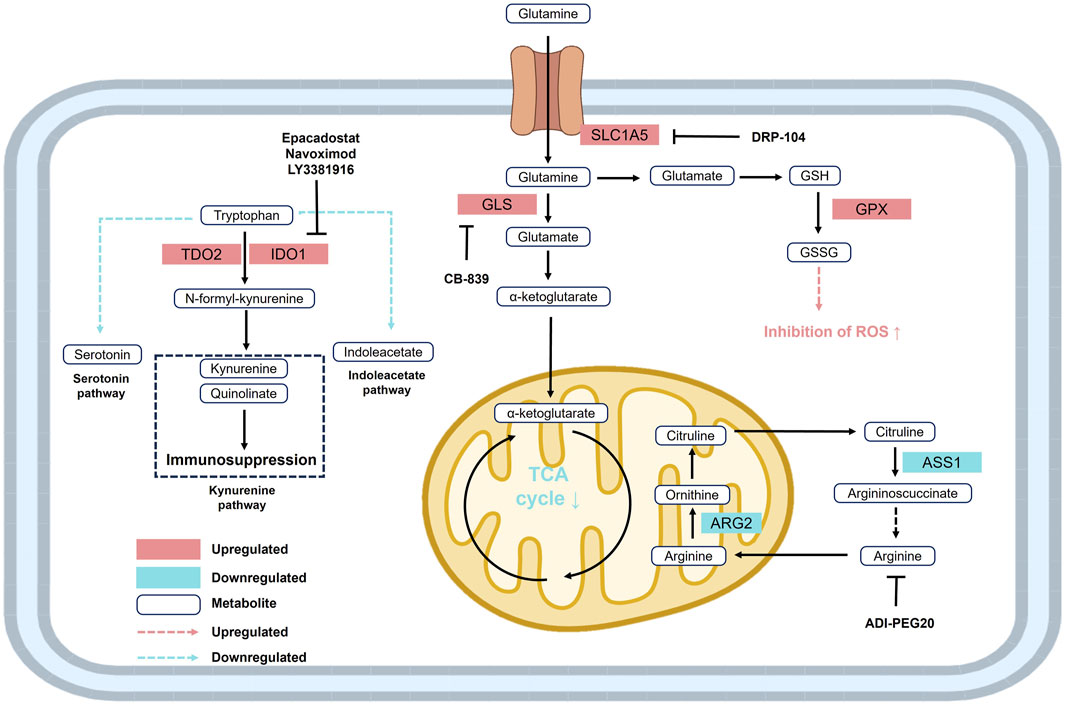 Diagram illustrating metabolic pathways involving tryptophan, glutamine and arginine. Tryptophan is converted to N-formyl-kynurenine via TDO2 and IDO1, leading to kynurenine and quinolinate, causing immunosuppression. Glutamine is converted to glutamate and further processed in the TCA cycle, involving components like α-ketoglutarate. The diagram shows inhibitors like Epacadostat and CB-839 and highlights the roles of enzymes like ARG2. Increased ARG2 and decreased ASS1 lead to arginine auxotrophy. Key pathways impacted include serotonin and indoleacetate, with metabolic effects noted as upregulated or downregulated.