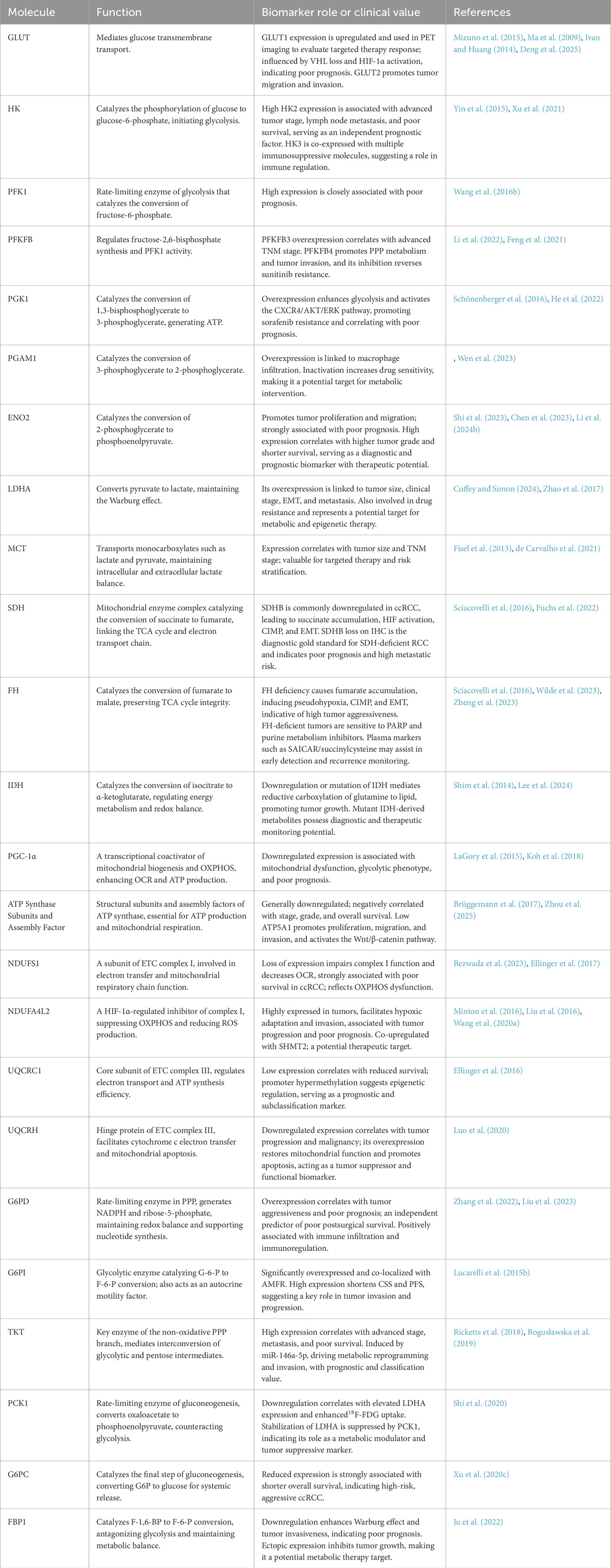 Phosphoglycerate kinase 1 (PGK1), another glycolytic enzyme upregulated in RCC, is significantly overexpressed in both ccRCC tumor tissues and patient serum, and is associated with poor prognosis (Schönenberger et al., 2016). Studies have demonstrated that PGK1 overexpression in ccRCC is accompanied by upregulation of other glycolytic enzymes and the chemokine receptor CXCR4, thereby enhancing glycolytic flux and activating CXCR4-mediated AKT and ERK signaling pathways. Furthermore, PGK1 contributes to resistance against the tyrosine kinase inhibitor sorafenib through activation of the CXCR4–ERK axis (He et al., 2022; Table 1).