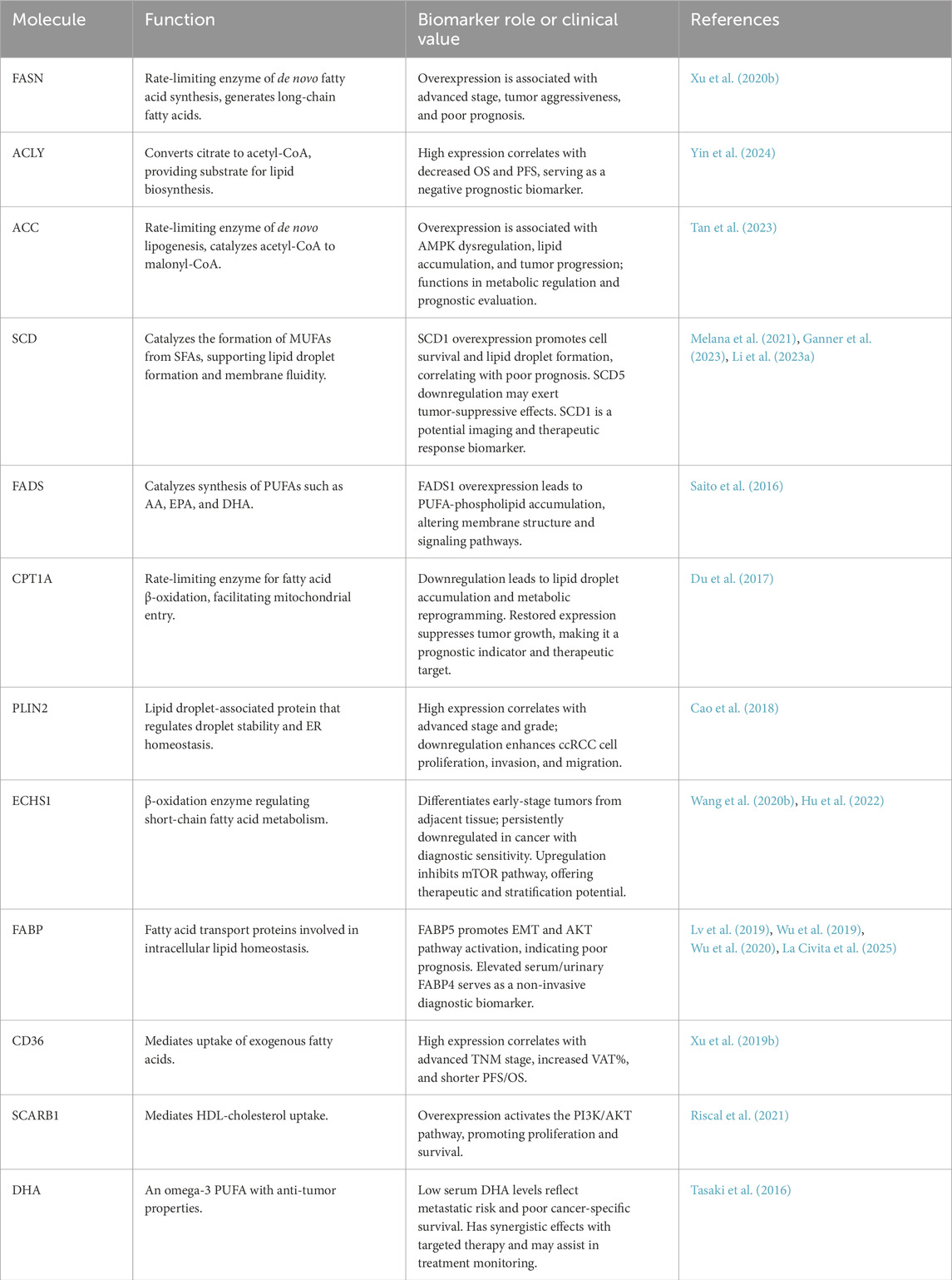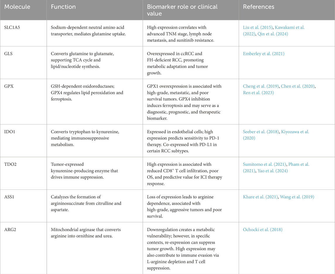 Recent studies have highlighted that RCC cells undergo metabolic reprogramming—a process whereby tumor cells restructure their metabolic pathways to meet the demands of uncontrolled proliferation and malignant progression. This reprogramming involves significant alterations in key metabolic pathways, including glucose, lipid, and amino acid metabolism (Jonasch et al., 2021b). Such metabolic dysregulation is often driven by aberrant expression of critical regulatory molecules and enzymes, which are closely associated with tumor progression, therapy resistance, and patient prognosis. These molecules show great promise as diagnostic and prognostic biomarkers as well as potential therapeutic targets.