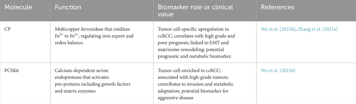 ENO2 (enolase 2, also known as neuron-specific enolase) is a key glycolytic enzyme that catalyzes the conversion of 2-phosphoglycerate to phosphoenolpyruvate (PEP), and its upregulation in various malignancies has garnered increasing attention in recent years. In both ccRCC and papillary RCC (pRCC), ENO2 is markedly overexpressed and is strongly associated with poor clinical outcomes (Shi et al., 2023; Chen et al., 2023). Mechanistically, ENO2 has been identified as a downstream target of HIF-1α. Studies have shown that HIF-1α transcriptionally activates ENO2 expression in renal cancer cells, thereby enhancing glycolytic activity, promoting glucose metabolism, and further supporting ccRCC proliferation and invasiveness—a metabolic hallmark closely aligned with the classical Warburg effect (Shi et al., 2023). At the cellular functional level, elevated ENO2 expression significantly promotes the migration, invasion, and proliferation of ccRCC cells. Given its pronounced oncogenic role in both ccRCC and pRCC, as well as its negative prognostic implications, multiple studies have proposed ENO2 as a diagnostic and prognostic biomarker with clear therapeutic potential (Shi et al., 2023; Li et al., 2024b). High ENO2 expression is not only indicative of higher tumor grade and shorter survival but also suggests that therapeutic targeting of ENO2 and its associated signaling pathways may offer a novel strategy to improve RCC treatment outcomes (Shi et al., 2023; Chen et al., 2023; Li et al., 2024b; Table 1).