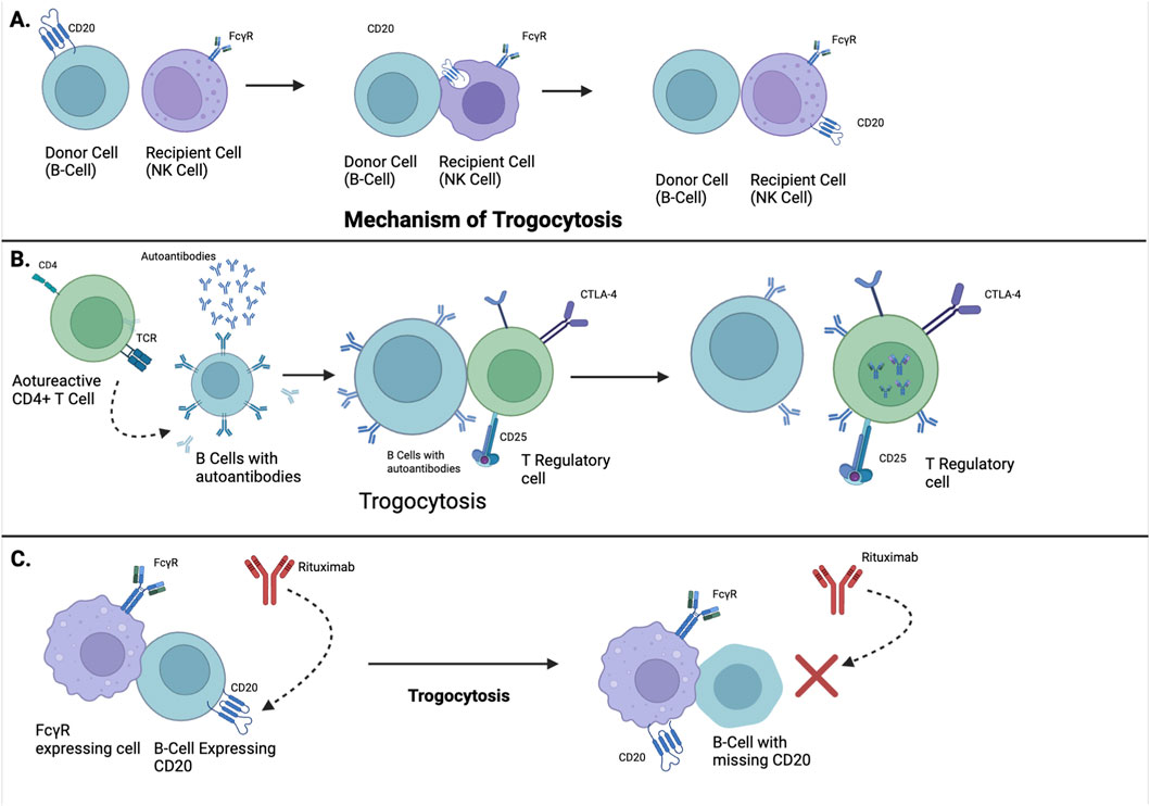 Furthermore, in lupus nephritis and cutaneous SLE, FcγR-mediated trogocytosis of immune complexes amplifies inflammation, promotes cytokine release, and causes donor cell damage, fueling autoantigen release and perpetuating chronic autoimmunity. Thus, trogocytosis represents a central but underexplored mechanism in lupus immunopathology (Newling et al., 2020).