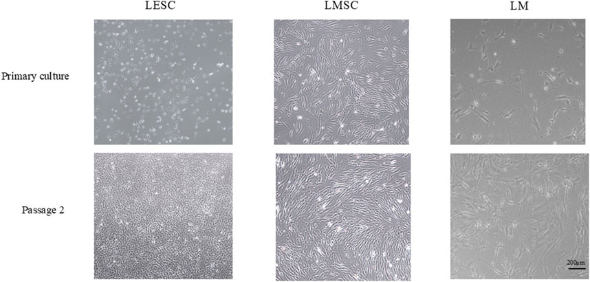 Previous studies have demonstrated that different limbal niche cells, including LESCs, could be isolated from limbal tissue using enzymatic digestion followed by culture in cell-type-specific supplemented media (Polisetti et al., 2022; Dziasko et al., 2015). In this study, the identity of LMSC, LESC, and LM isolated from the limbal tissue was confirmed by their morphological characteristics (Polisetti et al., 2022; Dziasko and Daniels, 2016; Dziasko et al., 2014; Polisetti et al., 2020) and expression of cell-type-specific immunophenotypic markers (Dziasko and Daniels, 2016; Dziasko et al., 2014; Polisetti et al., 2020; Cui and Man, 2023).