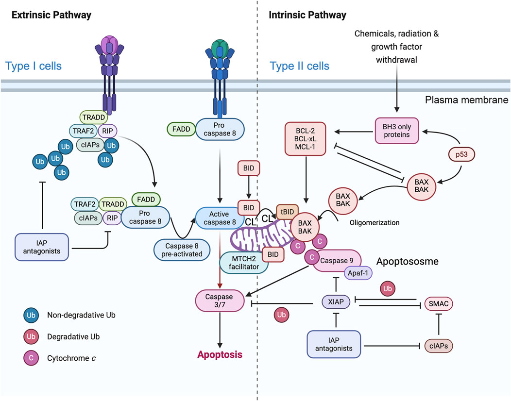 In type I cells (intrinsic cell death pathway), caspase-8 (in quite elevated amounts) directly processes and activates the effector caspases -3 and -7, which are sufficient to execute cell destruction (Scaffidi et al., 1999; Scaffidi et al., 1998). In type II cells (extrinsic cell death pathway), apoptosis induction also requires amplification (Scaffidi et al., 1999; Scaffidi et al., 1998) after caspase-8 to cleave the proapoptotic BH3-only BCL-2 family member BID, which is located in apposition to capase-8, forming tBID, which is primarily inserted into the MOM through cardiolipin and activates the proapoptotic BCL-2 family members BAX and BAK. The oligomerization of BAX/BAK induces MOMP, which results in the release of cytochrome c (Youle and Strasser, 2008) and other proteins in the mitochondrial intermembrane space (van Loo et al., 2002). Once in the cytosol, cytochrome c binds to Apaf-1 and recruits procaspase-9 into a complex called the “apoptosome,” which processes and activates the effector caspases -3 and -7 (Lane and Martin, 2010).