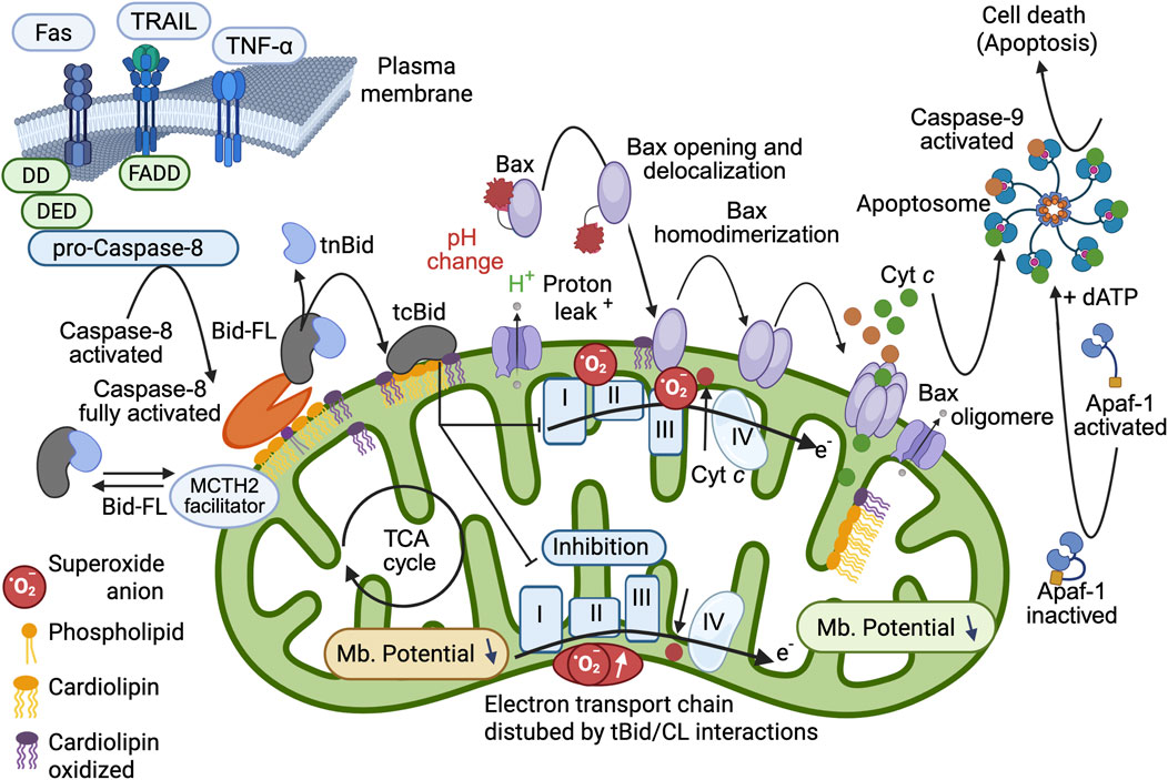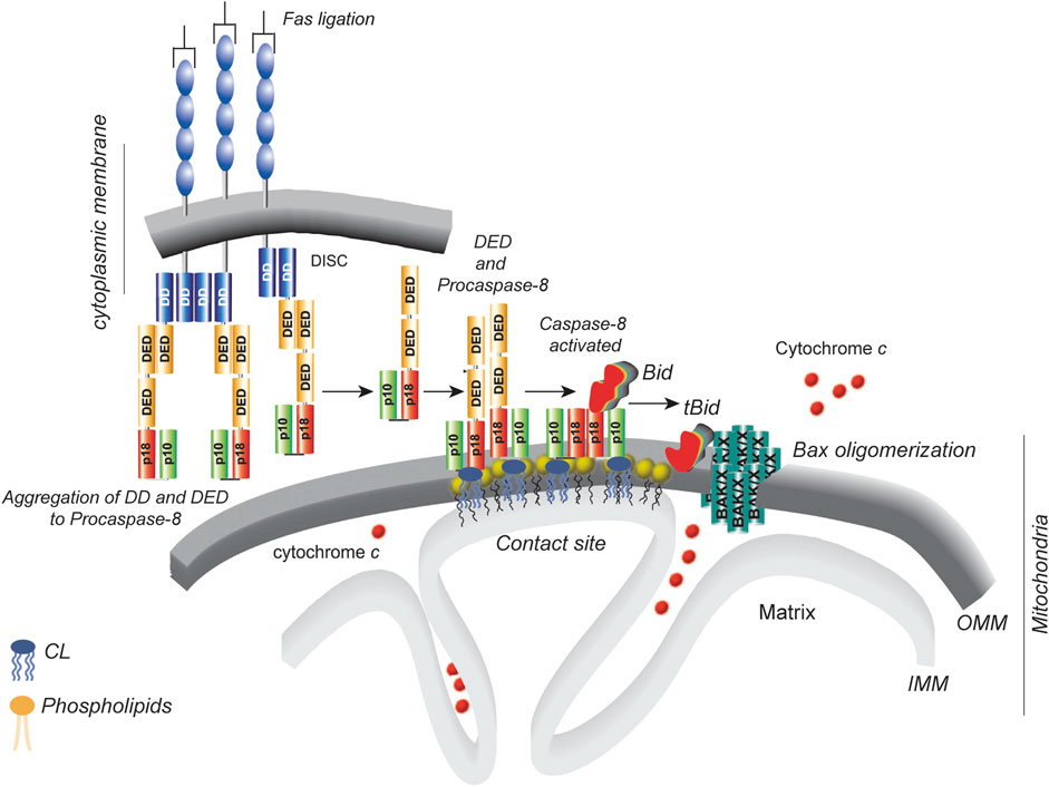 More specifically, pro-caspase-8 binds to death effector domains, where it is activated, and then binds to accessible cardiolipin at the MOM, where full activation occurs. The binding and insertion of BID appear to be very precise and involve an ordered sequence of events that primes the mitochondria for the action of BAX and BAK. BID then delocalizes from the cytoplasm to bind fully activated caspase-8 (bound to cardiolipin) and is then cleaved to yield its active counterpart, tBID, which also has a very high affinity for cardiolipin;