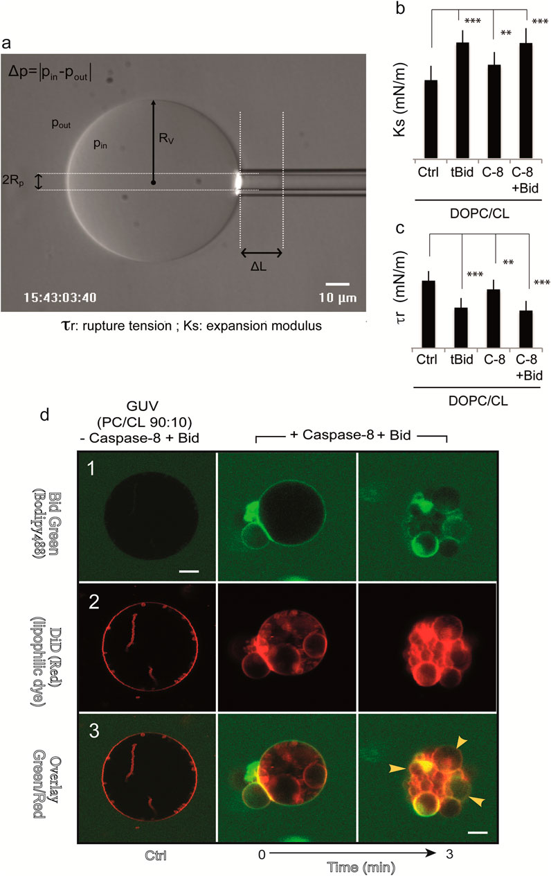 Figure 4. Mechanical properties of GUV vesicles when caspase8 is activated and BID is added. (a) Determination of the micromechanical properties of giant unilamellar vesicles (GUVs) via microaspiration. (a) Videomicrograph of a vesicle aspirated in a glass suction capillary. The main variables used to determine the area expansion modulus are as follows: RV, the vesicle radius; pin and pout, the pressure inside and outside the vesicle; and DL, the length of the membrane meniscus inside a glass pipette with an inner radius Rp. Excess membrane tension t is generated by suction such that △p≠0. (b,c) Histograms of the micromechanical quantities measured in the test system under different experimental conditions. (b) Ks: Young’s modulus (mN/m); (c) τr: Tensile strength (mN/m). Caspase-8 was added to a final concentration of 290 nM, tBID was added to 30 nM, and BID was added to 50 nM. Fisher’s test was used for statistical analysis of differences for both Ks and tr measurements (50 nM. Fisher’s test was used for statistical analysis of differences for both Ks and tr measurements (**, p = 0.01 and***p = 0.05). (d) Confocal microscopy study of BID and caspase-8 binding to giant unilamellar vesicles containing cardiolipin. Trios of images (top, middle and bottom) for the same sample: two images obtained with two different detector channels of the microscope, together with an overlay image. DOPC/CL (90:10) vesicles are shown in panels (1 - 3). Top: in (1), protein binding to GUVs is shown in green (this binding becomes apparent only when the green label accumulates at the membrane); middle: the GUV membrane was labeled with 0.05% of the hydrophobic dye DiO, as shown in (2); bottom: overlay of green and red images (3). The time is given in minutes. The arrows indicate a decrease in GUV fluorescence following the formation of a complex between procaspase-8 and BID-Alexa488, resulting in a nonfluorescent tBID. Schematic interpretation and confocal images are reproduced with permission from (Lutter et al., 2000).