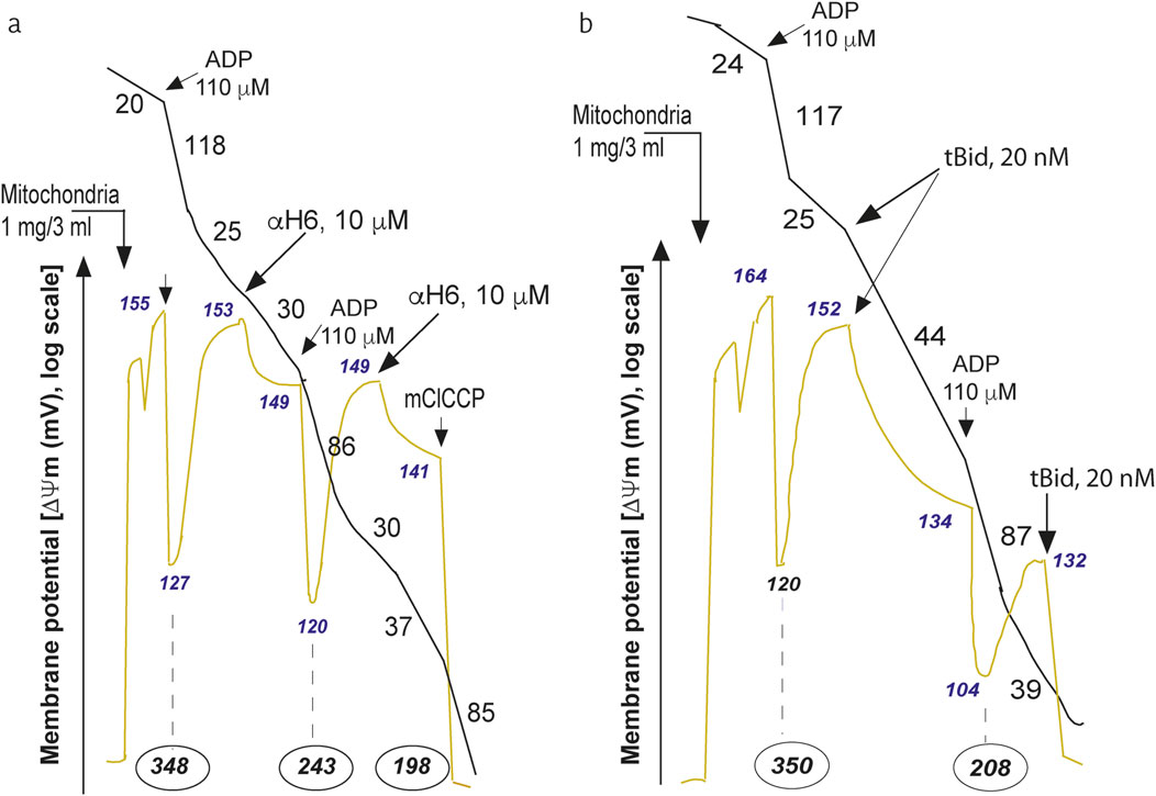 Figure 5. Mitochondrial bioenergetic changes induced by the a-H6 helicoidal peptide derived from tBID or by a recombinant tBID molecule. The