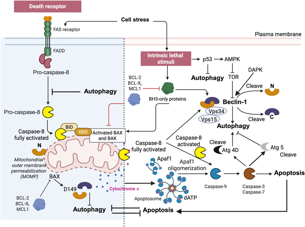 Figure 9. BID and tBID are also at the intersection of apoptosis and autophagy. The complex interplay between apoptosis and autophagy. Apoptosis can be triggered by external, receptor-dependent stimuli or by internal, mitochondria-mediated signaling. Moreover, apoptosis shares common stimuli and signaling pathways and exhibits some degree of mutual inhibition. During sustained exposure to apoptotic stimuli, caspase-mediated cleavage of Beclin 1 results in the generation of fragments (“N” and “C”) that lose their ability to induce autophagy. The C-terminal fragment translocates to the mitochondria and sensitizes cells to apoptotic signals. Although the apoptosis-associated cleavage of Beclin 1 and Atg5 inactivates autophagy, the cleavage of Atg4D by caspase-3 generates a fragment with increased autophagy activity. Moreover, autophagy inhibits apoptosis partly by degrading active caspase-8 or preventing the activation of BID by Beclin 1. The figure is directly inspired by the work of Kang et al. (2011) and Kang and Tang (2017).