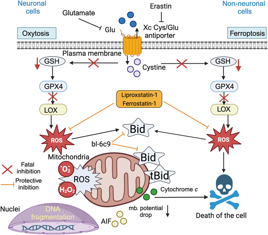 Indeed, the molecular mechanisms underlying oxytosis are remarkably similar, if not identical, to the cell death process termed ferroptosis several years later, when the involvement of iron-dependent lipid peroxidation (Latunde-Dada, 2017) was first described, and both pathways are currently thought to involve one and the same process. Oxytosis/ferroptosis has emerged as a potential key factor in the progression of neurodegenerative diseases, linking various mechanisms such as oxidative stress, mitochondrial dysfunction, and immune dysregulation, and it likely plays an important role in these interconnected pathways, making it a promising target for therapeutic innovation. Therefore, it is more likely that oxytosis and ferroptosis should be regarded as two names for the same cell death pathway (Lewerenz et al., 2018). Oxytosis is a paradigm of oxidative cell death that has been established in neuronal cells (Tan et al., 2001) (Figure 10). Oxytosis can be induced in neuronal cells via glutamate-mediated inhibition of the cystine-glutamate antiporter (Xc-). Such depletion of the intracellular glutathione pool decreases GSH levels (Tan et al., 2001) and impairs the redox defense of neuronal cells, resulting in increased ROS levels that can trigger caspase-independent cell death 6, 67]. In particular, GSH depletion promotes the inhibition of glutathione peroxidase-4 (Gpx4) and the enhancement of 12/15-lipoxygenase (LOX) activity, both of which are key steps upstream of mitochondrial dysfunction (Grohm et al., 2010; Tobaben JG et al., 2011; Dixon et al., 2012; Dixon, 2017). In neuronal oxytosis paradigms, mitochondrial impairment is mediated by mitochondrial transactivation of the proapoptotic protein BID (Dixon, 2017; Linkermann et al., 2014; Friedmann Angeli et al., 2014) (Figure 9). Upon translocation to the mitochondria, BID mediates the loss of mitochondrial integrity and function and the deleterious translocation of mitochondrial AIF to the nucleus (Landshamer et al., 2008; Hu et al., 2017). Ferroptosis has been described as an iron-dependent form of oxidative cell death in cancer cells and in neurons (Murphy, 2018; Shen et al., 2018; Kenny et al., 2019). Notably, ferroptotic cell death has also been observed in kidney cells (Muller et al., 2017; Li et al., 2021; Sato et al., 2018). Ferroptosis involves the generation of ROS via iron-dependent enzymatic reactions mediated by lipoxygenases, xanthine oxidases, NADPH oxidase or catalase. In addition to iron-chelating compounds, ferroptosis can be blocked by ferrostatin-1, a potent inhibitor that mediates protective effects against erastin-induced ferroptosis by inhibiting lipid peroxidation (Latunde-Dada, 2017; Conrad et al., 2018). Mechanisms of ferroptosis have also been identified in neurons, death signaling pathways induced by cerebral ischemia (She et al., 2020), glutamate-induced neurotoxicity in organotypic hippocampal slice cultures (Zou and Crews, 2005), and (Song et al., 2021). Like glutamate-induced oxytoxicity, erastin activates ferroptosis by inhibiting the Xc− transporter. However, in contrast to oxytosis, ferroptosis in cancer cells is not associated with mitochondrial damage (Ding et al., 2025). In fibroblasts and kidney cells, ferroptosis is accompanied by prototypical changes in mitochondrial morphology, including reduced organelle size, the disappearance of mitochondrial cristae, increased mitochondrial membrane density, and the rupture of the mitochondrial outer membrane (Liu et al., 2023).
