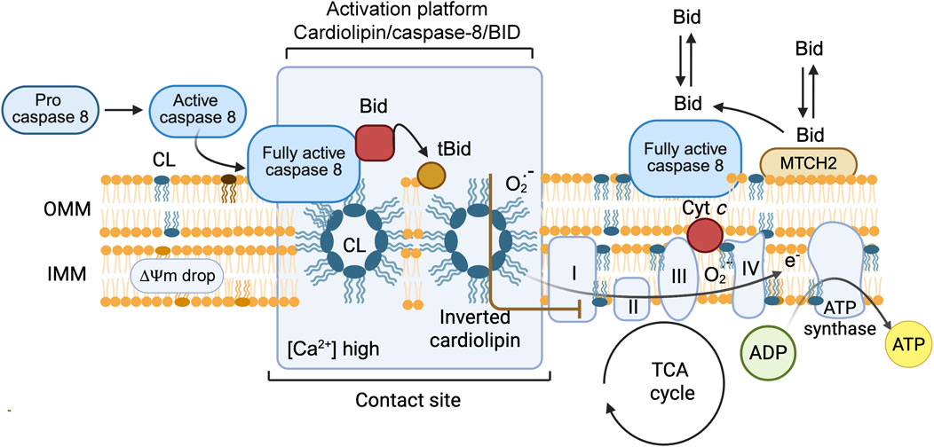 Figure 6. Schematic interpretation of the mitochondrial changes induced by full Caspase-8 activation, cardiolipin binding of BID and tBID insertion into the MOM. Refined model of the pro-apoptotic function of tBID that sets the importance of tBID/CL interactions. First, BID binds to the CL present at the contact site (or MICOS) via its charged α-helices (see Figure 2) and destabilizes the mitochondrial membrane. The interaction of tBID with CL (i.e., following the interaction of preactivated caspase-8 with CL) disrupts the organization of the mitochondrial membrane at the contact sites (and certainly throughout the entire IMM). The induced structural changes, as well as the immediate generation of peroxidized CL, disrupt the activity of the electron transport chain complexes (reduced electron transport rate) and lead to cytosolic acidification, mitochondrial ROS production, and total mitochondrial lipid peroxidation. This environment can prime the activation of BAX and/or BAK and allow their activation and delocalization (with first homodimerization and then oligomerization at the membrane to form a pore). Moreover, tBID interacts through its BH3 domain with BAX and/or BAK and enhances membrane anchorage, which results in the liberation of cytochrome c to form apoptosomes in the cytoplasm with dATP, APAF-1 and caspase-9, which become activated and act as the main executioner caspases in cell death. This schematic interpretation was drawn partly with the Scientific Image and Illustration Software/Biorender and is inspired by (Gonzalvez et al., 2005a) but remains under the copyrigth of @Patrice X. Petit.